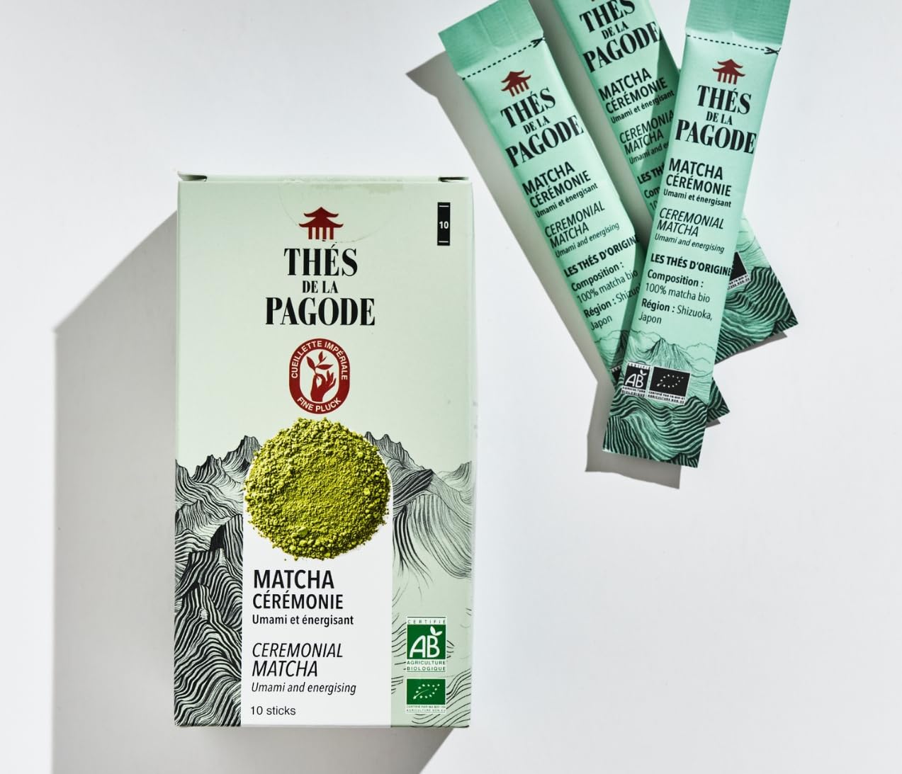 Thés de La pagode - Matcha Cérémonie Bio Japonais - Umami et Énergisant - Sans Amertume - Poudre 100 Issue de Feuilles de Tencha Ombragées - 10 Sticks