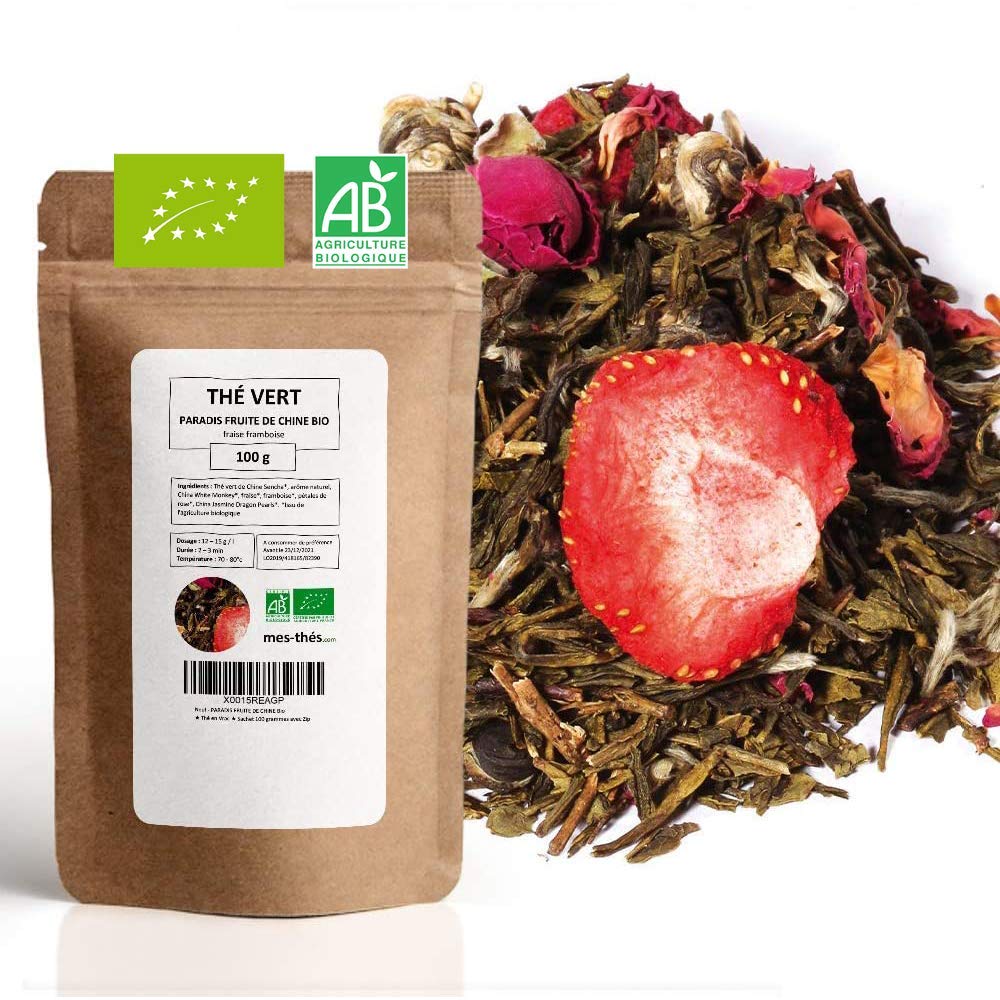 Th Vert bio Fraise Framboise - 100g (40 tasses) - Th en vrac 100% agriculture biologique - Mes-Th s