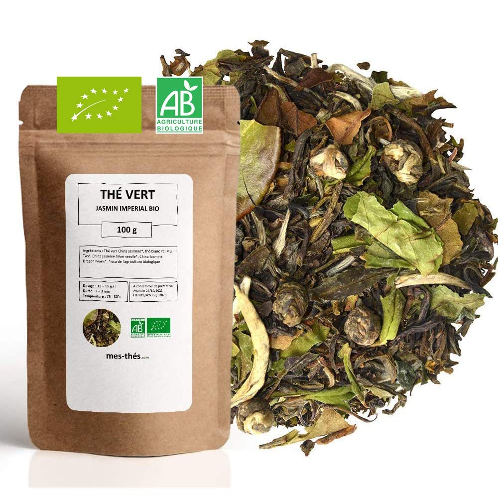 ? CERTIFIED ORGANIC AND ECO-FRIENDLY: Certified FR-BIO-01, this Mes-Thés organic green tea respects the environment and is part of a sustainable approach. It's an ideal choice for those looking for a product that is both delicious and kind to the planet. Mes-Thés is a French brand. DIRECTIONS FOR USE: For a perfect infusion, use 12 to 15 g of green tea per liter of water. Let it steep for 2 to 3 minutes at a temperature of 70 to 80 C to fully release its flavors and preserve its benefits. LOOSE LEAF TEA FOR A PERFECT BREW: Opt for this organic loose leaf green tea, ideal for fully releg its flavors and aromas. Prepare each cup according to your preferences, adjusting the amount and steeping time to your taste. AN ALLY FOR YOUR WELL-BEING: Green tea is known for its antioxidant properties and health benefits. Drink it daily to strengthen your body while enjoying a revitalizing break. HIGH-QUALITY ORGANIC GREEN TEA: Discover this organic green tea, grown using organic farming methods. Carefully crafted by Mes-Thés to offer an infusion rich in flavor and natural benefits. An ideal drink for a moment of relaxation and revitalization every day.? CERTIFIÉ BIO ET ÉCO-RESPONSABLE : Certifié FR-BIO-01, ce thé vert bio Mes-Thés respecte l'environnement et s'inscrit dans une démarche durable. C'est un choix idéal pour ceux qui recherchent un produit à la fois délicieux et respectueux de la planète. Mes-Thés est une marque Française. CONSEILS D'UTILISATION : Pour une infusion parfaite, utilisez 12 à 15 g de thé vert par litre d'eau. Laissez infuser 2 à 3 minutes à une température de 70 à 80 C pour révéler toutes ses saveurs et conserver ses bienfaits. THÉ EN VRAC POUR UNE INFUSION PARFAITE : Optez pour ce thé vert bio en vrac, idéal pour libérer pleinement ses saveurs et ses arômes. Préparez chaque tasse selon vos envies, en adaptant dosage et temps d'infusion à votre goût. UN ALLIÉ POUR VOTRE BIEN-ÊTRE : Le thé vert est reconnu pour ses propriétés antioxydantes et ses bienfaits pour la santé. Consommez-le quotidiennement pour renforcer votre organisme tout en profitant d'une pause revitalisante. THÉ VERT BIO DE HAUTE QUALITÉ : Découvrez ce thé vert bio, issu de l'agriculture biologique. Soigneusement élaboré par Mes-Thés pour offrir une infusion riche en saveurs et en bienfaits naturels. Une boisson idéale pour un moment de détente et de revitalisation au quotidien.Thé Vert bio Jasmin Bio Imperial - 100g (40 tasses) - Thé en vrac 100 agriculture biologique - Mes-Thés