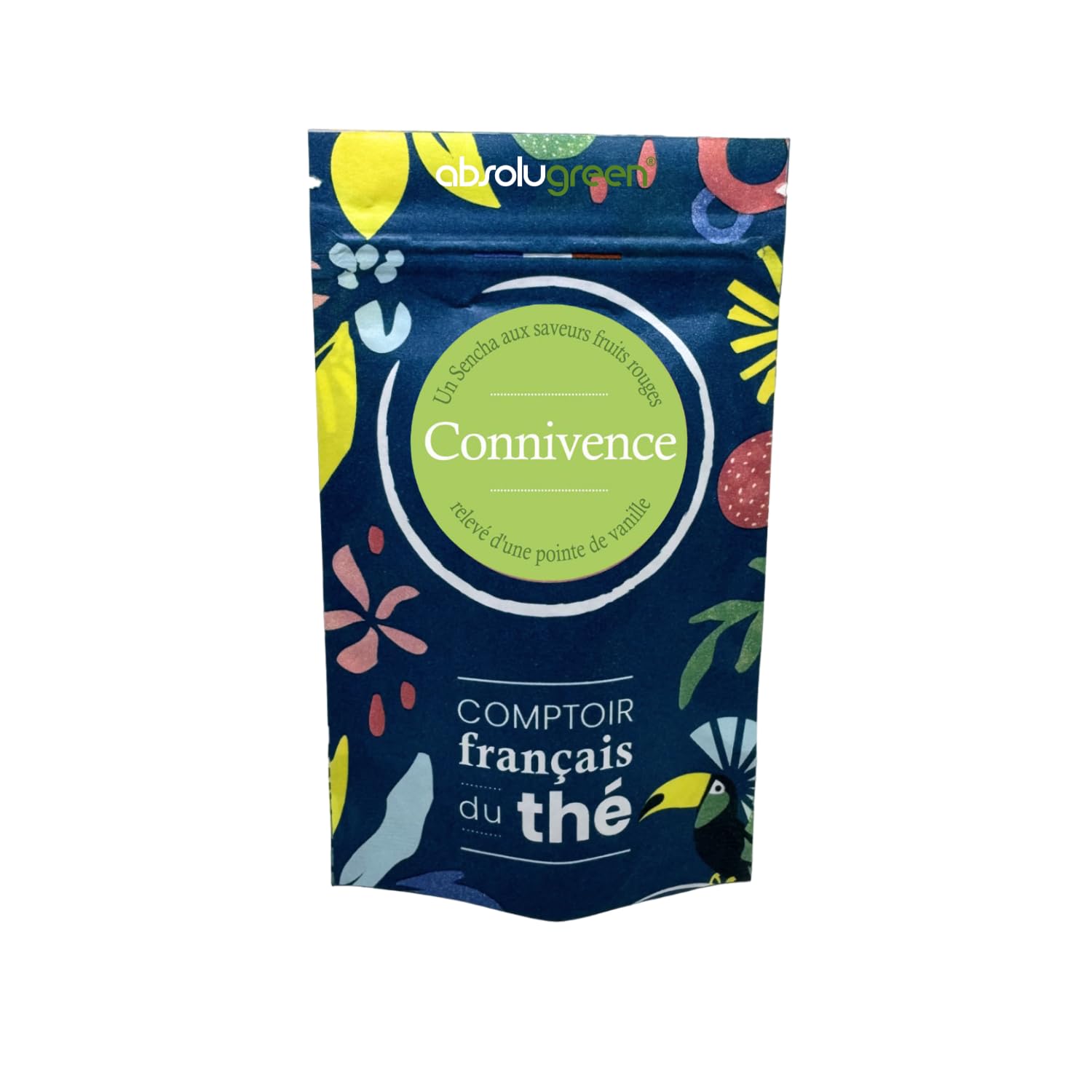 Green Tea in a Doypack, Loose Leaf 80 Grams. This Sencha, studded with whole currants, exudes the aroma of red berries with a hint of vanilla. Together, they form a powerful blend of nutrients and antioxidants. A tea with a deliciously fruity and naturally sweet taste. Connivence Green Tea.Thé Vert en Doypack, Vrac 80 Grammes. Ce Sencha parsemé de groseilles entières, exhale le parfum des fruits rouges auréolé d'une pointe de vanille. Ensemble, ils forment un puissant mélange de nutriments et d'antioxidants. Un thé au goût délicieusement fruité et naturellement sucré. Thé Vert Connivence.Thé Vert Connivence - Comptoir Français du Thé - Thé Vert fruits rouges pointe de vanille - Maison Française - Thé en vrac