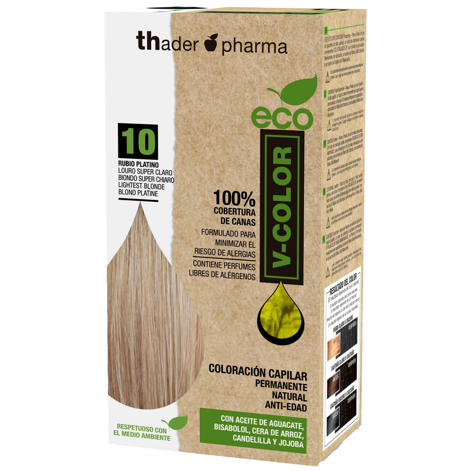 If you are looking for complete gray coverage, choose the permanent Coloration V-Color Eco. Properties of the V-Color Eco color set: Intensive, perfect and natural colors. - Maximum efficacy and color fastness. - 100 gray coverage - without ammonia for a pleasant scent - environmentally friendly - shine and suppleness of the hair. This set contains: a permanent hair color of 60 ml. - An oxygen supply of 60 ml. - 1 pair of gloves. 1 x hair mask, 10 ml. The V-Color Eco hair dye set for home provides a natural-looking, permanent hair color and anti-aging effect. Moreover, it has been developed to minimize the risk of allergies. V-Color Eco hair dye set for home without ammonia for a pleasant scent with 100 gray coverage.Thader Th Pharma Eco V-Color Permanent Kit, 60 ml (nr. 10 Platinblond)Als je op zoek bent naar een volledige grijsdekking, kies dan voor de permanente Coloration V-Color Eco. Eigenschappen van de V-Color Eco kleurenset: Intensieve, perfecte en natuurlijke kleuren. - Maximale werkzaamheid en kleurvastheid. - 100 grijsdekking - zonder ammoniak voor een aangename geur - milieuvriendelijk - glans en soepelheid van het haar. Deze set bevat: een permanente haarkleur van 60 ml. - Een zuurstoftoevoer van 60 ml. - 1 paar handschoenen. 1 x haarmasker, 10 ml. De V-Color Eco haarverfset voor thuis zorgt voor een natuurlijk uitziende, permanente haarkleur en anti-aging effect. Bovendien is hij ontwikkeld om het risico op allergieën te minimaliseren. V-Color Eco haarverfset voor thuis zonder ammoniak voor een aangename geur met 100 grijsdekking.