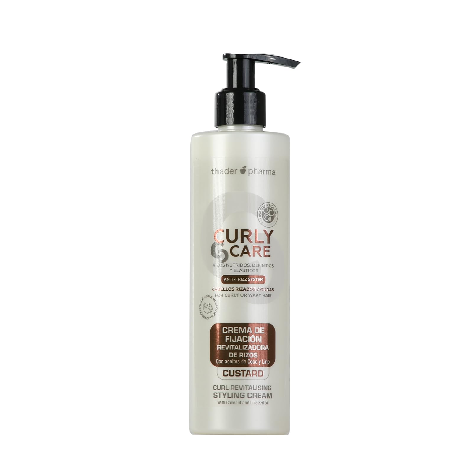 300 ml. Crème de fixation revitalisante des boucles idéale pour cheveux colorés ou avec des mèches. Nourrit les cheveux abîmés, en leur redonnant l humidification naturelle et en revitalisant la boucle. Anti-frisottis. DES BOUCLES NOURRIES, DÉFINIES ET ÉLASTIQUES. CHEVEUX COLORÉS OU AVEC DES MÈCHES. Crème de fixation revitalisante des boucles sans rinçage Custard Curly Care pour des Cheveux Bouclés Ondulés.