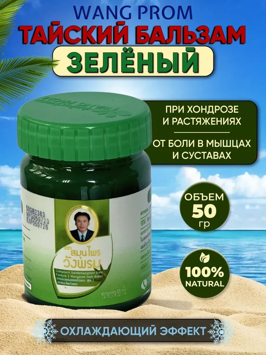 Тайский бальзам Вангпром — незаменимый помощник в домашней аптечке. Они подходят для всех, включая женщин, мужчин, пожилых людей и детей. Зелёный тайский бальзам обладает охлаждающим эффектом, поэтому он хорошо помогает снять отёк тканей и воспаление. Он эффективен при артритах, радикулитах, ушибах, травмах, растяжениях, укусах, болях в спине, пояснице и мышцах, заложенности носа и синяках. Прост в использовании. Нужно втирать небольшое количество бальзама в больное место два-три раза в день, и уже через час вы почувствуете облегчение. Втирать нужно примерно одну минуту до полного впитывания. Подходит спортсменам, можно использовать перед тренировкой для разогрева мышц и после для снятия напряжения и спазмов. Наносить в малых количествах. На область поясницы достаточно одной-двух горошин, а на колено — половины горошины. Баночки объёмом 50 мл хватит на много применений. Эффект наступает через 5–10 минут, а через 15–20 минут он достигнет своего пика. Ощущение приятного холода или жжения сохранится на протяжении 2–3 часов.