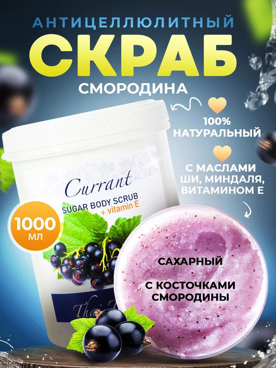 Антицеллюлтный сахарный скраб для тела Смородина от Тай Традишнз с тающей текстурой и ароматом листьев и ягод смородины отлично отшелушивает благодаря кристаллам сахара среднего помола и косточкам смородины. Многогранные, обладающие высокой абсорбирующей способностью, легко плавящиеся от тепла рук, кристаллы сахара и косточки смородины обеспечивают нетравматичное и тщательное скрабирование.