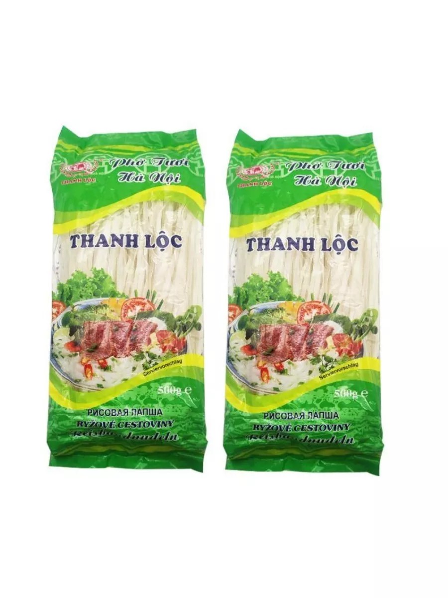 THANH LOC Rice Noodles for Pho Soup, 500 g, 2 pcs. Rice noodles from Vietnam. Excellent as a side dish for hot dishes of Pan-Asian cuisine and a classic ingredient in Vietnamese Pho soup. Ingredients: tapioca starch, rice, water. Nutritional value per 100 g: 364 kcal / 1522 kJ, protein 5.95 g, fat 0.5 g, carbohydrates 80 g. Storage conditions: store in a cool, dry place, avoid direct sunlight. Shelf life: 2 years.
