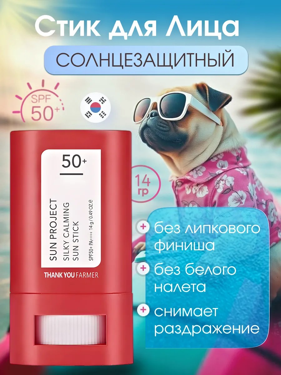 Защитите свою кожу от ультрафиолетовых лучей с солнцезащитным стиком SPF 50+ от корейского бренда Thank You Farmer Sun Project Silky Calming Sun Stick во флаконе 14 г. Наслаждайтесь его легкой текстурой и нелипким финишем. Благодаря экстракту центеллы азиатской, он успокаивает раздражения и шелушения. Не оставляет белого налета, обеспечивает матовость без эффекта маски и защищает от пигментации. Его удобно наносить на лицо, шею и тело, он не забивает поры, не течет и не пачкает одежду. Компактный и экономичный, он идеально подходит для чувствительной кожи. Возьмите его с собой в горы или на пляж - ваша кожа будет гладкой и защищенной в течение всего дня. Откройте стик, повернув основание, чтобы выдвинуть продукт. Нанесите на лицо и тело за 15 минут до выхода на солнце. При необходимости повторяйте нанесение. При использовании после макияжа аккуратно распределите по лицу легкими похлопывающими движениями. Предостережения: прекратите использование при появлении покраснения или зуда. Обратитесь к врачу, если симптомы сохраняются.Не наносите на поврежденную кожу. Храните в недоступном для детей месте, вдали от прямых солнечных лучей.