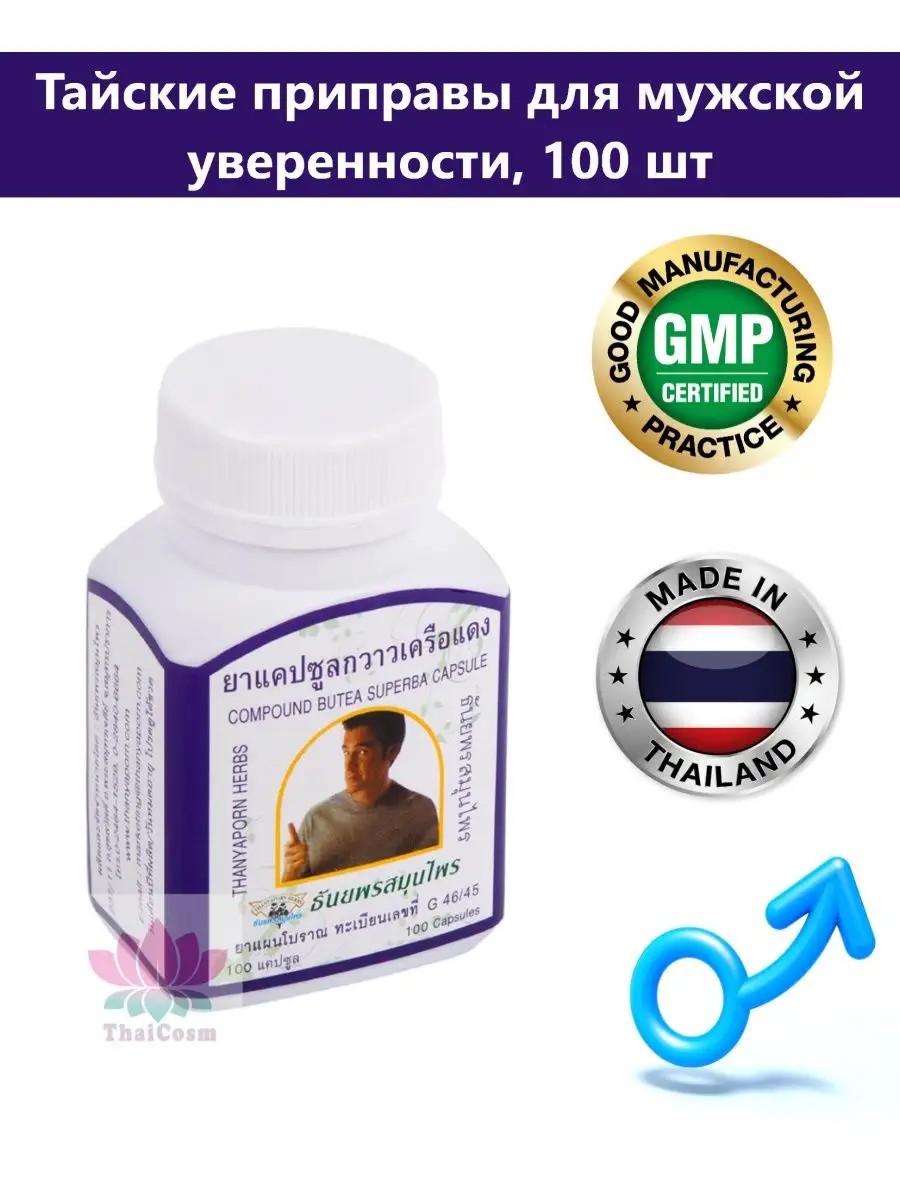 Butea Superba является очень эффективным и очень безопасным, 100% растительным продуктом. Он содержит уникальные фитофлавоноиды, которые помогают улучшить качество половой жизни, решить проблему эректильной дисфункции, продлить удовольствие во время секса и ощутить более яркие и красочные оргазмы.Выдающиеся повышающие либидо свойства Квао Круа давно известны местным жителям. В течение сотен лет Квао Круа использовался в качестве основного ингредиента традиционных тайских травяных лекарств и считается национальным достоянием тайской медицины.Большинство питательных веществ находится в большой подземной системе клубневых корней и используется для улучшения эрекции, повышения либидо, тонуса и настроения у мужчин.За прошедшие годы исследователи и ученые со всего мира проявили огромный интерес к свойствам натуральной тайской виагры – корню Бута Суперба.Butea Superba лучше всего подходит для мужчин и содержит очень много фитоандрогенов, которые имитируют мужские гормоны. Они полезны для восстановления силы костей и мышц, ловкости, восстановления роста волос, улучшения сексуального желания.Корень Бутеи также помогает снизить холестерин и служит профилактикой инфаркта и инсульта.Он содержит флавоноиды и флавоноидные гликозиды, которые помогают с сердечно-сосудистыми функциями.Butea Superba подходит – корень долголетия, восстановления сексуальных способностей, снижения утомляемости, а также для лечения гипертонии или нарушений холестерина в крови. Свойства тайской виагры Бутеа СупербаButea Superba увеличивает приток крови к пенису, который укрепляет пенис, увеличивает сексуальное возбуждение и повышает эрекциюКапсулы Бутеа Суперба также продлевают сексуальную активностьБутеа Суперба снижают уровень холестерина в кровиButea Superba уменьшает усталость, увеличивает энергию и является естественным источником незаменимых витаминов, минералов и фитоандрогенов, которые очень полезны для мужского здоровья и благополучияПолностью натуральный продукт! Не содержит искусственных добавок и красителей!Противопоказания – Не выявлено никаких побочных эффектов. Не рекомендуется принимать людям до 18 и старше 75 лет.Имеет международный сертификат соответствия GMP, а также зарегистрирован в Министерстве здравоохранения Таиланда.===Способ применения: по 2 капсуле 2 раза в день до еды.