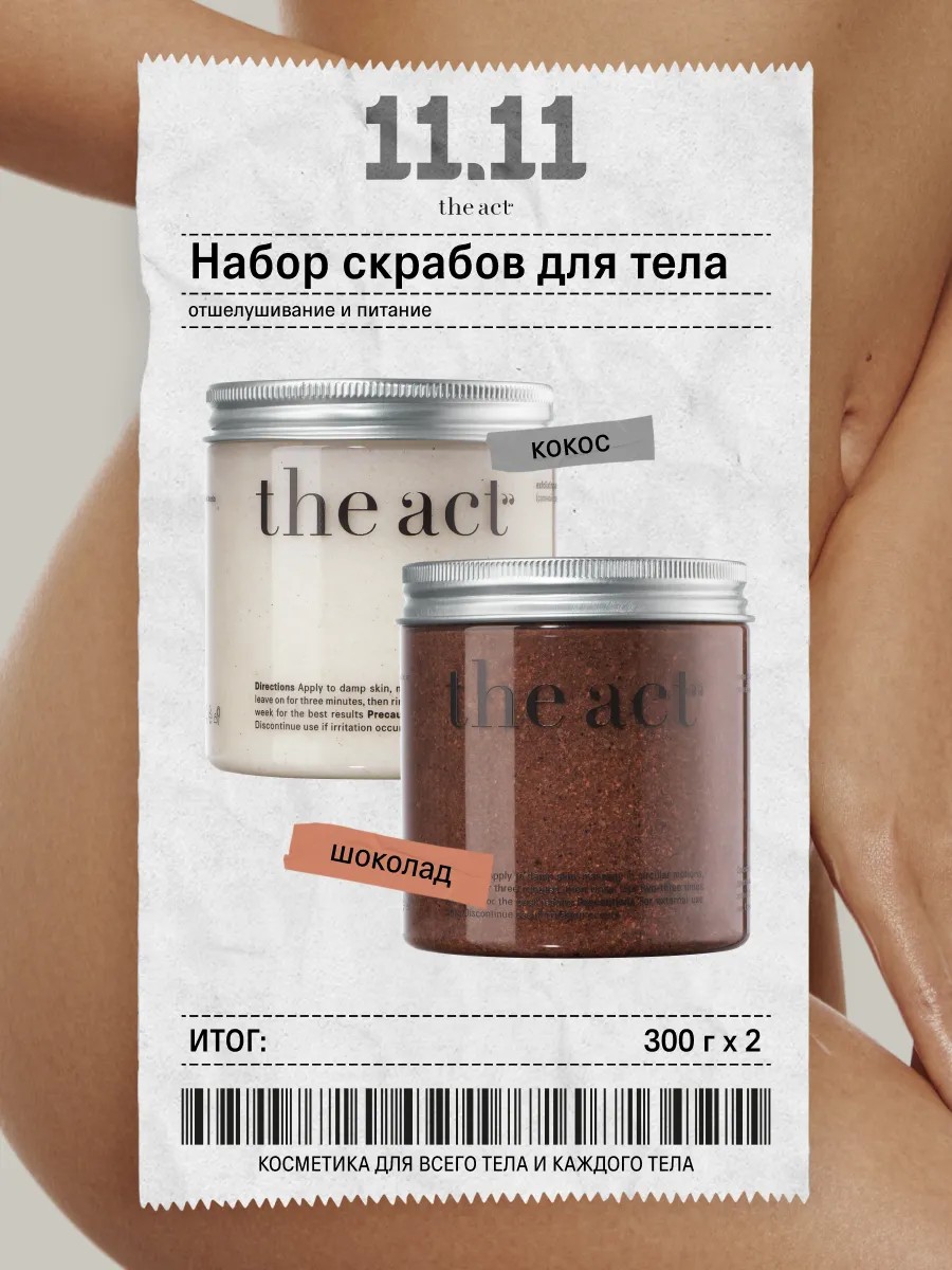 Набор бестселлеров The Act — легендарный соляной скраб-бальзам с пленительным ароматом натурального кокоса и кофейный скраб для тела с густым обволакивающим запахом шоколада.