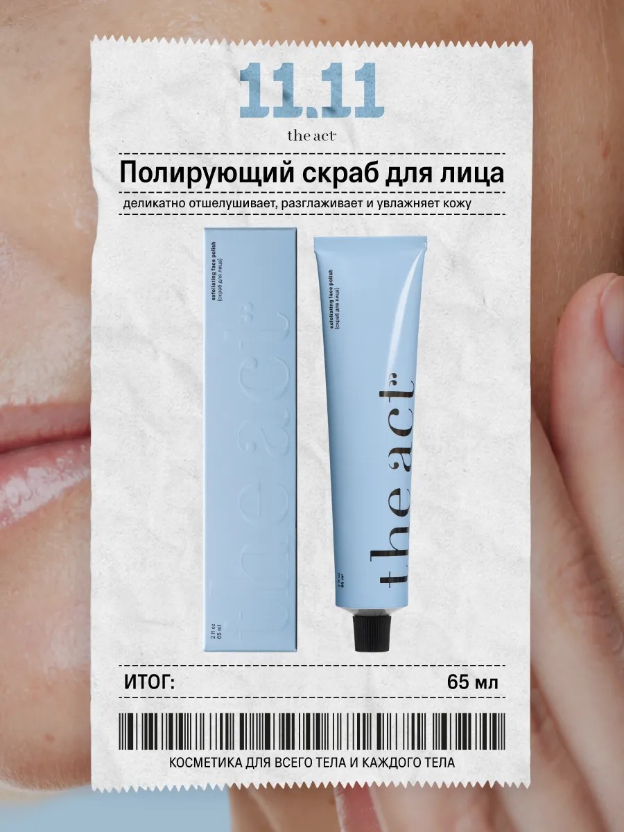 Скраб для лица The Act — нежная терапия очищения и обновления кожи. Он деликатно отшелушивает и очищает кожу лица, удаляет омертвевшие клетки и излишки себума с ее поверхности, обновляет клеточный цикл, выравнивает текстуру и тон, восстанавливает барьерную функцию, делает кожу гладкой и сияющей.