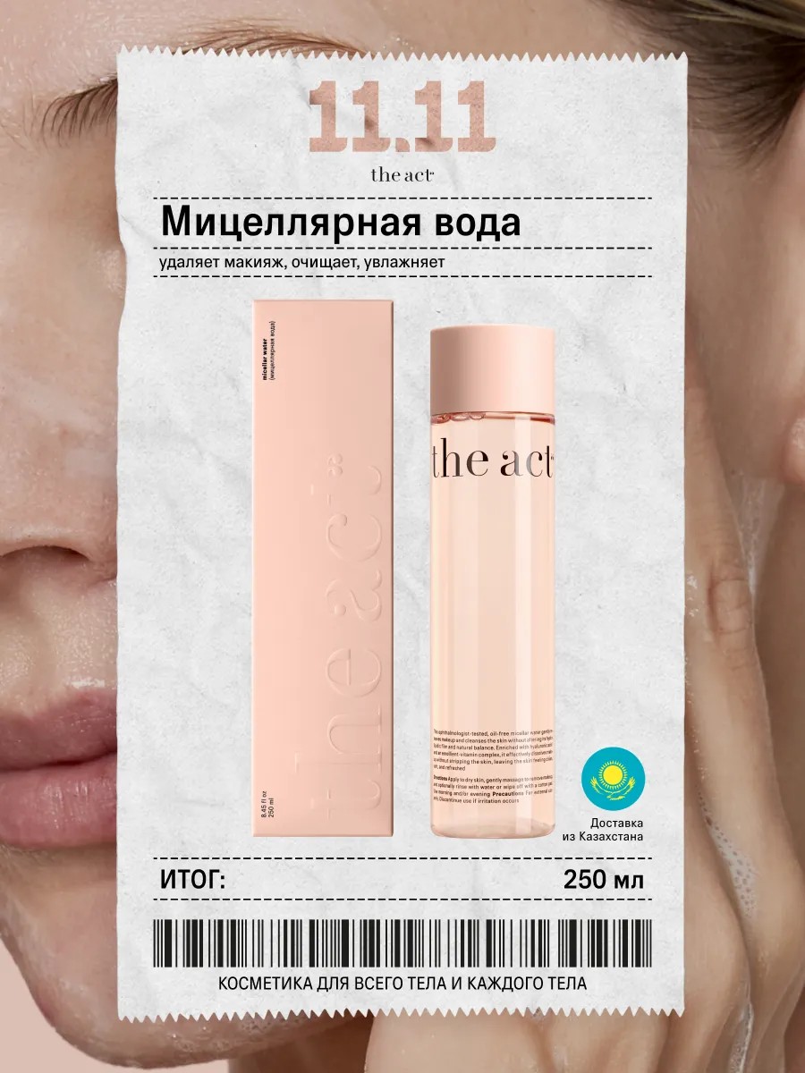 Сотрите всё лишнее! Мицеллярная вода The Act мягко и эффективно удаляет макияж и очищает кожу, не нарушая её естественный баланс. Формула с гиалуроновой кислотой и витаминным комплексом оставляет кожу чистой и свежей, укрепляя её защитные функции.