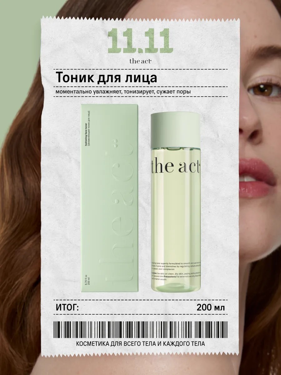 The Act cleansing toner restores skin radiance and elasticity, promotes better penetration of active ingredients in creams and serums, reduces transepidermal water loss, stimulates the skin's protective functions, and maintains a normal microbiome.