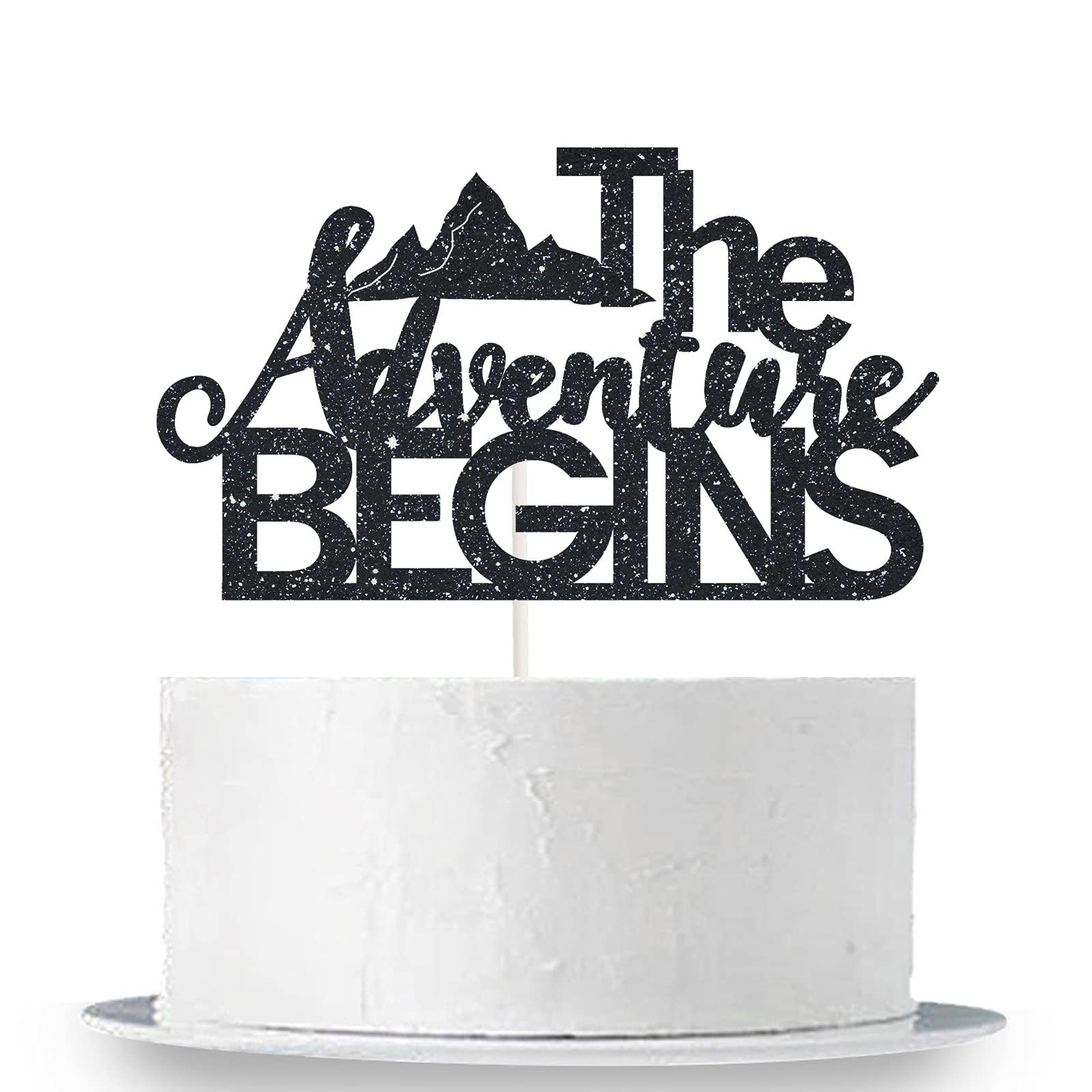 The Adventure Begins Cake Topper Black Glittery Going Away Party Cake Decor Couple Adventures/Adventure Awaits/Bon Voyage/Journey Honeymoon Themed Wedding Engagement Party Cake Supplies Decorations