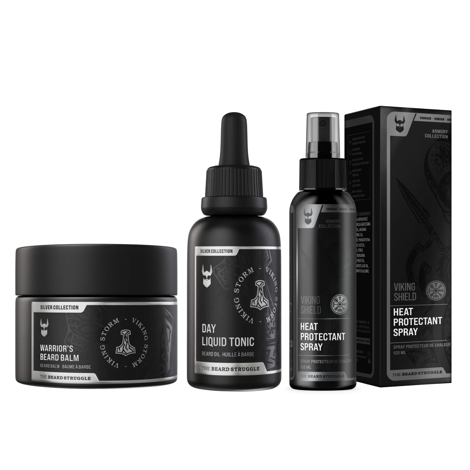 The Beard Struggle Beard & Hair Heat Protectant Spray Warrior s Beard Balm & Day Liquid Tonic Beard Oil Bundle Nourishes & Revitalizes Beard Hair - Silver Collection - Viking Storm