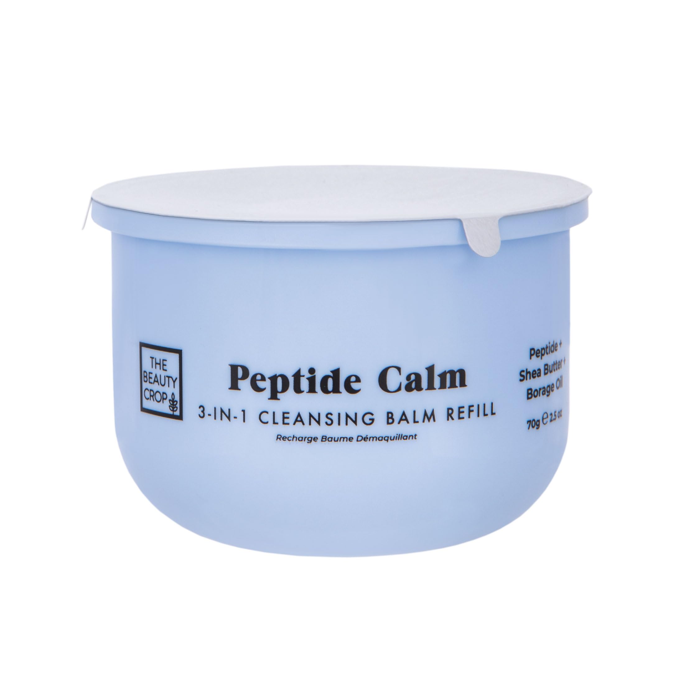 Ideal for all skin types: This balm transforms into a silky oil that dissolves even stubborn makeup (including waterproof) while keeping your skin balanced and hydrated, making it perfect for all skin types, even sensitive and acne-prone skin. Eco-friendly refill: Enjoy an eco-friendly glow with sustainable refills, allowing you to contribute to a more sustainable skincare routine—great for your skin and the planet! Nourishing shea butter: Infused with soothing shea butter, this balm deeply nourishes your skin while cleansing, thanks to its powerful anti-inflammatory properties that lock in moisture. Powerful peptide formula: Packed with skin-loving ingredients, including collagen-boosting peptides, this cleansing balm helps minimize the appearance of fine lines and wrinkles for a visibly smoother complexion. Your skincare hero: Meet your new skincare hero! This luxurious, refillable balm melts away makeup, dirt, and impurities in one swipe, leaving your skin soft, clean, and pampered for a refreshed glow.Idéal pour tous les types de peau : ce baume se transforme en une huile soyeuse qui dissout même le maquillage tenace (y compris imperméable) tout en gardant votre peau équilibrée et hydratée, ce qui le rend parfait pour tous les types de peau, même les peaux sensibles et sujettes à l'acné. Recharge écologique : profitez d'une lueur écologique avec des recharges durables, vous permettant de contribuer à une routine de soins de la peau plus durable, idéale pour votre peau et la planète!. Beurre de karité nourrissant : infusé avec du beurre de karité apaisant, ce baume nourrit votre peau en profondeur tout en le nettoyant, grâce à ses puissantes propriétés anti-inflammatoires qui retiennent l'humidité. Formule peptidique puissante : rempli d'ingrédients qui aiment la peau, y compris des peptides stimulant le collagène, ce baume nettoyant aide à minimiser les rides et ridules pour un teint visiblement plus lisse. Votre héros de soins de la peau : rencontrez votre nouveau héros de soins de la peau! Ce baume luxueux et rechargeable fait fondre le maquillage, la saleté et les impuretés en un seul geste, laissant votre peau douce, propre et choyée pour un éclat rafraîchi.The Beauty Crop Recharge Peptide Calm Cleansing Balm - Nourrissant et Hydratant, Convient à tous les types de peau, végétalien - 100 ml Recharge de baume nettoyant peptide