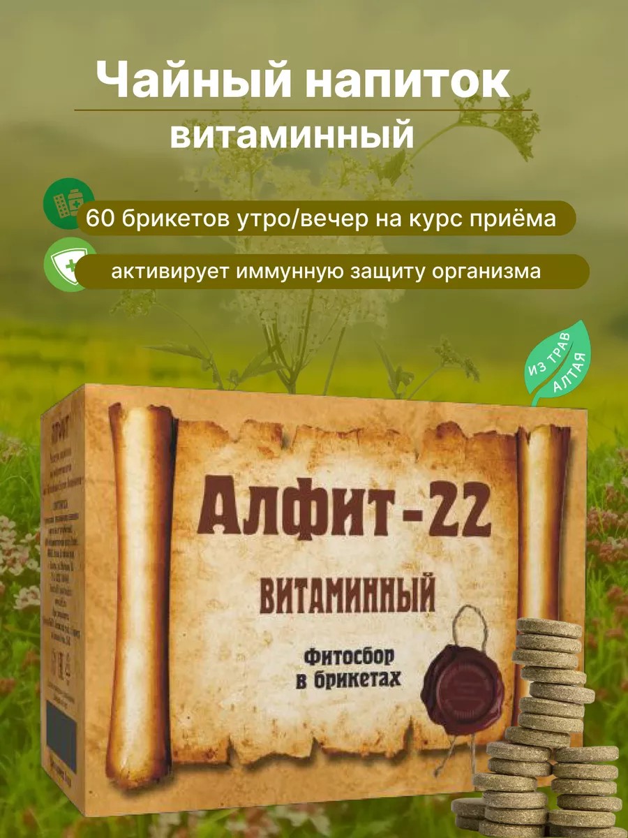 Alfit-22 Vitamin Phytostrain. Altai herbal infusion for immunity. The herbs included in the composition contain a physiologically balanced complex of vitamins (A, B1, B2, C, E, PP, K) and microelements (Cu, Fe, Mn). Rosehips and currants are the "champions" among plants in vitamin C content. Rowan berries enrich the collection with vitamins A and E. Meadowsweet and ziziphora promote active absorption of vitamins. Bergenia leaf has a mild immunomodulatory effect. Ingredients: Morning: black currant (leaf), cinnamon rosehip, bergenia (leaf), common rowan, meadowsweet. Evening: black currant (leaf), cinnamon rosehip, thick-leaved bergenia (leaf), common rowan, ziziphora clinopodium. Directions: Pour 0.5–1 cup of boiling water over 1 briquette (2 g). Let steep for 5–10 minutes. Adults take 0.5–1 cup of warm Alfit-22 Vitamin herbal tea morning and evening with meals. Duration of use: 1 month.