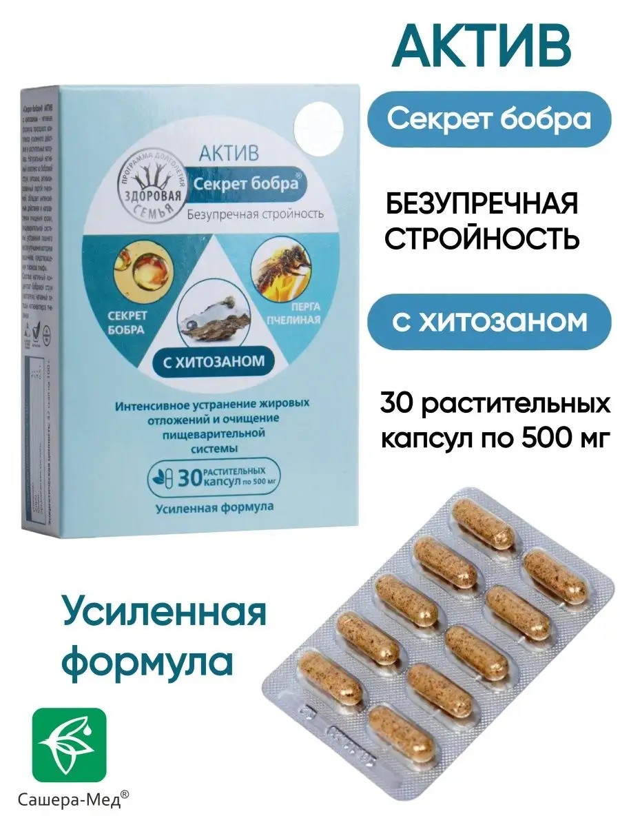 Секрет бобра актив с хитозаном – нативная формула природного комплекса усиленного действия в растительных капсулах. Натуральный нативный комплекс из бобровой струи, хитозана, активизированный пергой пчелиной, обладает интенсивным действием в направлении очищения крови, пищеварительной системы, устранения лишнего веса, улучшения моторики кишечника и предотвращения токсикоза лимфы: