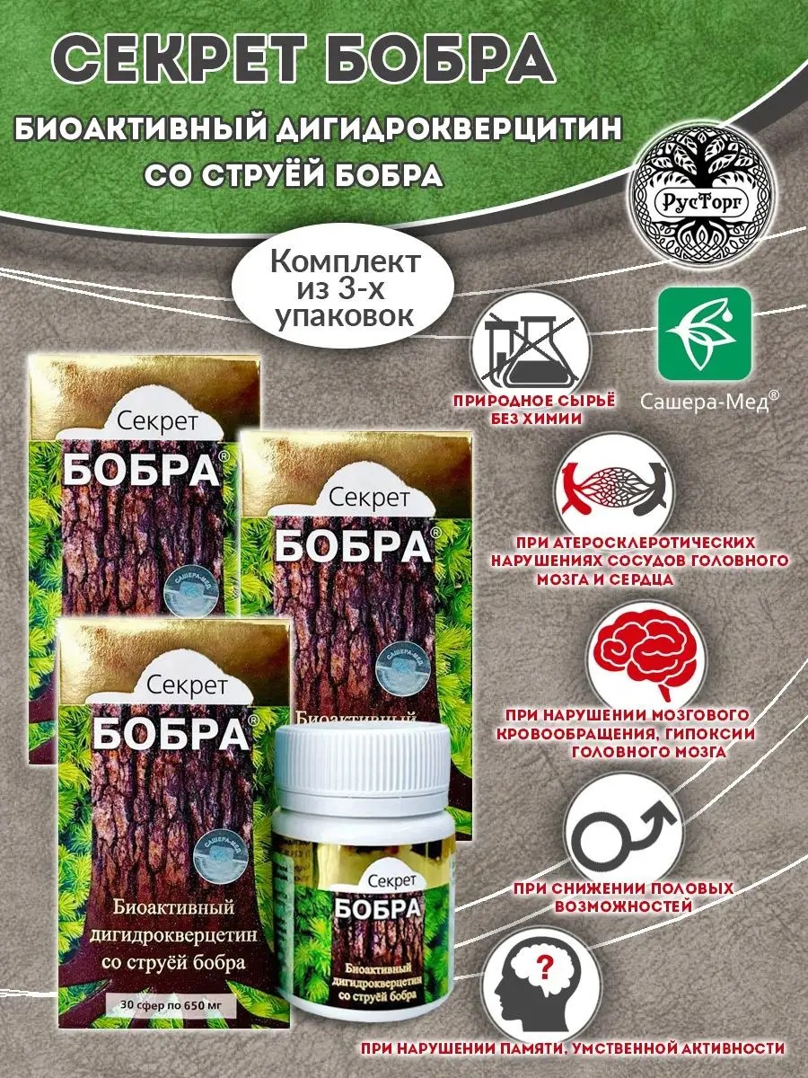 Биоактивный дигидрокверцетин лиственницы сибирской в сочетании с мускусом бобра оказывают комплексное благоприятное воздействие на все системы организма (нервную, опорно-двигательную, иммунную, сердечно-сосудистую, эндокринную, мочеполовую). Натуральные экстракты комплекса помогают повысить тонус сосудов, укрепить капилляры, нормализовать артериальное давление, улучшить состав крови, устранить вегетососудистые нарушения. Арабиногалактан в составе продукта регулирует функции иммунной системы, выводит токсичные вещества, тем самым улучшая работу печени. Композицию дополняет сибирская лиственница, магния цитрат, кастореум, полипренолы пихты сибирской, экстракты чаги, рейши, спирулины, инулин, ресвератрол. Главной составляющей является дигидрокверцетин лиственницы сибирской, который благотворно влияет на психоэмоциональное состояние, препятствует развитию слабоумия, борется с воспалительными процессами, нормализует уровень холестерина в крови и положительно воздействует на мозговое кровообращение и внутриглазное давление. Средство эффективно борется со всеми видами аллергии и её проявлениями. Секрет бобра от давления является действенным биорегулятором, а так же обеспечивает не только крепкое здоровье, но и эстетику лица и тела без сосудистых сеточек. Сферы струя бобра повышают работоспособность и улучшают половые функции. Продукт не содержит токсических веществ, поэтому разрешается применять его в период беременности и при лактации. Также препарат отлично подходит детей с трехлетнего возраста, он позволит запустить умственную активность и речь. Способ применения детям 3-6 лет - принимать по 1/2 сферы на голодный желудок 1 раз в день. Курс – 10 дней. Рекомендуется курс повторить 3 раза с интервалом 1 месяц. Детям 6-9 лет: употреблять по 1/2 сферы на голодный желудок 2 раза в день. Курс – 10 дней. Рекомендуется курс повторить 3 раза с интервалом 1 месяц. Детям 9-12 лет: принимать по 1/2 сферы на голодный желудок 2 раза в день. Курс – 20 дней. Для взрослого человека доза увеличивается до 1 целой сферы на голодный желудок 1 раз в день. Курс – 30 дней. Курс рекомендуется повторить 3 раза с интервалом 1 месяц. Противопоказанием является индивидуальная непереносимость компонентов состава. Срок годности 2 года.