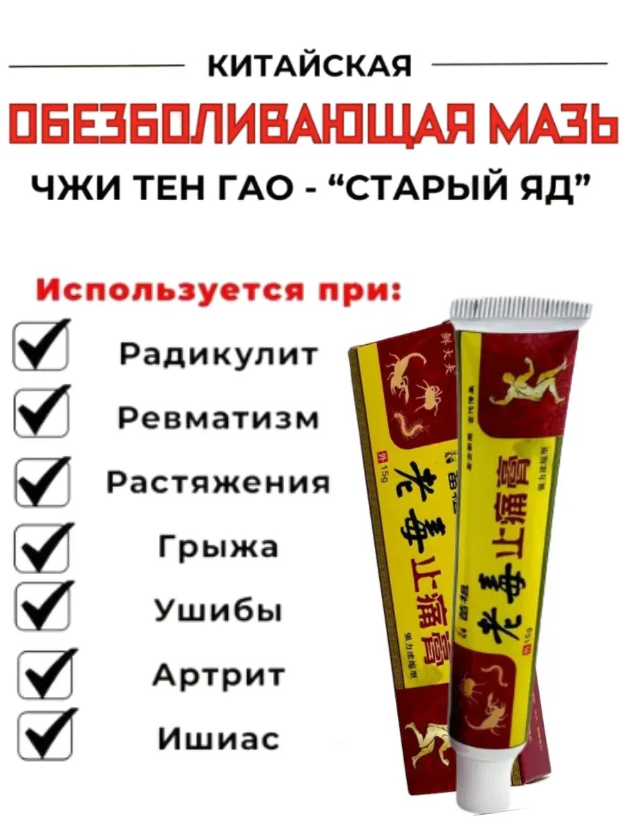 Китайская обезболивающая мазь «Чжи Тен Гао» («Старый Яд») — универсальное натуральное средство для облегчения различных видов боли и воспаления. Эта китайская мазь от боли создана по древним рецептам и не содержит гормонов, благодаря чему является безопасным выбором для регулярного применения. Мазь эффективно помогает при боли в пояснице, шее, спине, при радикулите, воспалении суставов и конечностей, ревматоидном артрите, растяжении связок, синяках, ушибах, а также после тяжелых физических нагрузок.