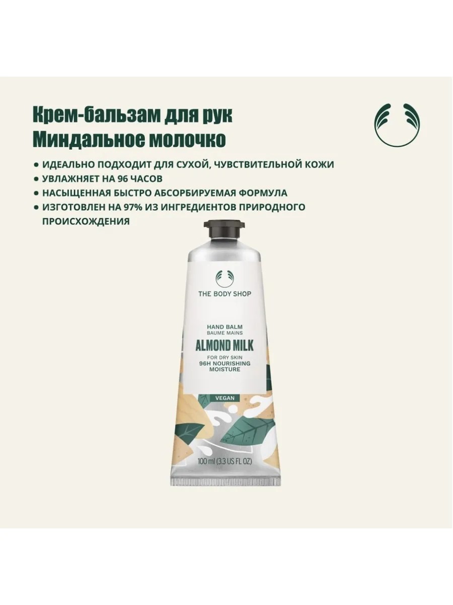 Изготовленный на 97% из ингредиентов природного происхождения, включая органическое миндальное молочко от Community Fair Trade из Испании и сделанное вручную масло ши от Community Fair Trade из Ганы, наш веганский бальзам не только прекрасно заботится о ногтях и кутикулах, но и увлажняет сухую, чувствительную кожу рук до 96 часов.br Легкая формула продукта быстро абсорбируется кожей, не оставляя ощущение жирности или липкости. Наш ароматный крем поставляется в удобной упаковке, поэтому просто забросьте его в сумочку и используйте в любом месте как только почувствуете, что вашим ручкам необходимо питание и мягкость.br Просто выдавите небольшое количество в чистые ладошки.