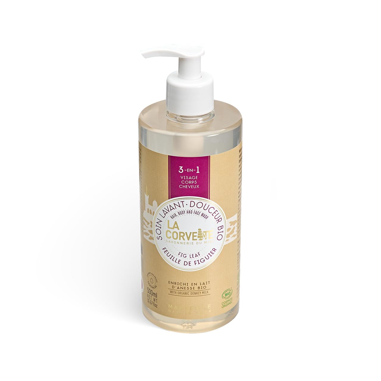 Pamper your skin with our 3-in-1 liquid soap with fig leaf. Ideal for face, body and hair, certified BIO and made in France. The formula consists of 97.5 natural ingredients and gently cleanses while moisturizing thanks to donkey milk and vegetable glycerin. The natural scent of fig leaf evokes freshness and Mediterranean softness. A sensory and effective care for daily use by the whole family. SAFETY WARNING For external use only. Avoid contact with eyes.Fresh and vegetal perfume of fig leaf. Enriched with donkey milk and vegetable glycerin. Organically certified COSMOS ORGANIC. 97.5 natural ingredients, mild for the skin. All-in-one care for face, body and hair.La Corvette – Vloeibare zeep 3-in-1 vijgenblad – gezicht, lichaam, haren – met ezelmelk – biologisch gecertificeerd – 500 ml Verwen je huid met onze 3-in-1 vloeibare zeep met vijgenblad. Ideaal voor gezicht, lichaam en haar, gecertificeerd BIO en gemaakt in Frankrijk. De formule bestaat voor 97,5 uit natuurlijke ingrediënten en reinigt zacht terwijl het hydrateert dankzij ezelinnenmelk en plantaardige glycerine. De natuurlijke geur van vijgenblad roept frisheid en Mediterrane zachtheid op. Een zintuiglijke en doeltreffende verzorging voor dagelijks gebruik door het hele gezin. VEILIGHEIDSWAARSCHUWING For external use only. Avoid contact with eyes.Fris en plantaardig parfum van vijgenblad. Verrijkt met ezelinnenmelk en plantaardige glycerine. Biologisch gecertificeerd COSMOS ORGANIC. 97,5 natuurlijke ingrediënten, mild voor de huid. Alles-in-één verzorging voor gezicht, lichaam en haar.