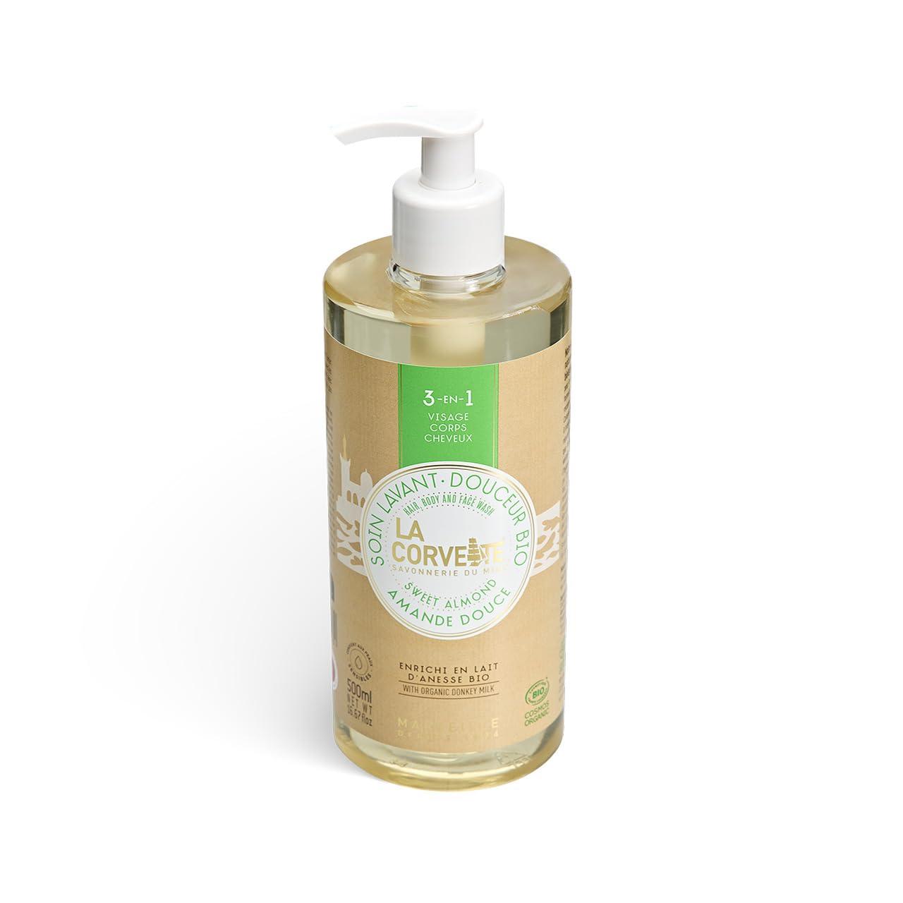Discover our 3-in-1 liquid soap with sweet almond, a certified organic care product made in France, suitable for the whole family. With 97.5 natural ingredients, it gently cleanses face, body and hair. Enriched with donkey milk and vegetable glycerin, it intensively moisturizes and respects sensitive skin. The natural scent of sweet almond offers a moment of comfort and softness in the shower. Certified COSMOS ORGANIC by Ecocert, this daily care combines effectiveness, sensory and ecological commitment. SAFETY WARNING For external use only. Avoid contact with eyes.Made in France with respect for cosmetic craftsmanship. Moisturizing and gentle thanks to donkey milk and vegetable glycerin. Certified BIO COSMOS ORGANIC by Ecocert. 97.5 of natural origin, without unnecessary additives. 3-in-1 care for face, body and hair.La Corvette – Vloeibare zeep 3-in-1 zoete amandel – gezicht, lichaam, haren – met ezelmelk – biologisch gecertificeerd – 500 ml Ontdek onze 3-in-1 vloeibare zeep met zoete amandel, een gecertificeerd biologisch verzorgingsproduct gemaakt in Frankrijk, geschikt voor het hele gezin. Met 97,5 natuurlijke ingrediënten reinigt het zachtjes gezicht, lichaam en haar. Verrijkt met ezelinnenmelk en plantaardige glycerine hydrateert het intensief en respecteert het de gevoelige huid. De natuurlijke geur van zoete amandel biedt een moment van comfort en zachtheid onder de douche. Gecertificeerd COSMOS ORGANIC door Ecocert, combineert deze dageljkse verzorging effectiviteit, zintuiglijkheid en ecologische betrokkenheid. VEILIGHEIDSWAARSCHUWING For external use only. Avoid contact with eyes.Gemaakt in Frankrijk met respect voor cosmetisch vakmanschap. Hydraterend en zacht dankzij ezelinnenmelk en plantaardige glycerine. Gecertificeerd BIO COSMOS ORGANIC door Ecocert. 97,5 van natuurlijke oorsprong, zonder overbodige toevoegingen. 3-in-1 verzorging voor gezicht, lichaam en haar.