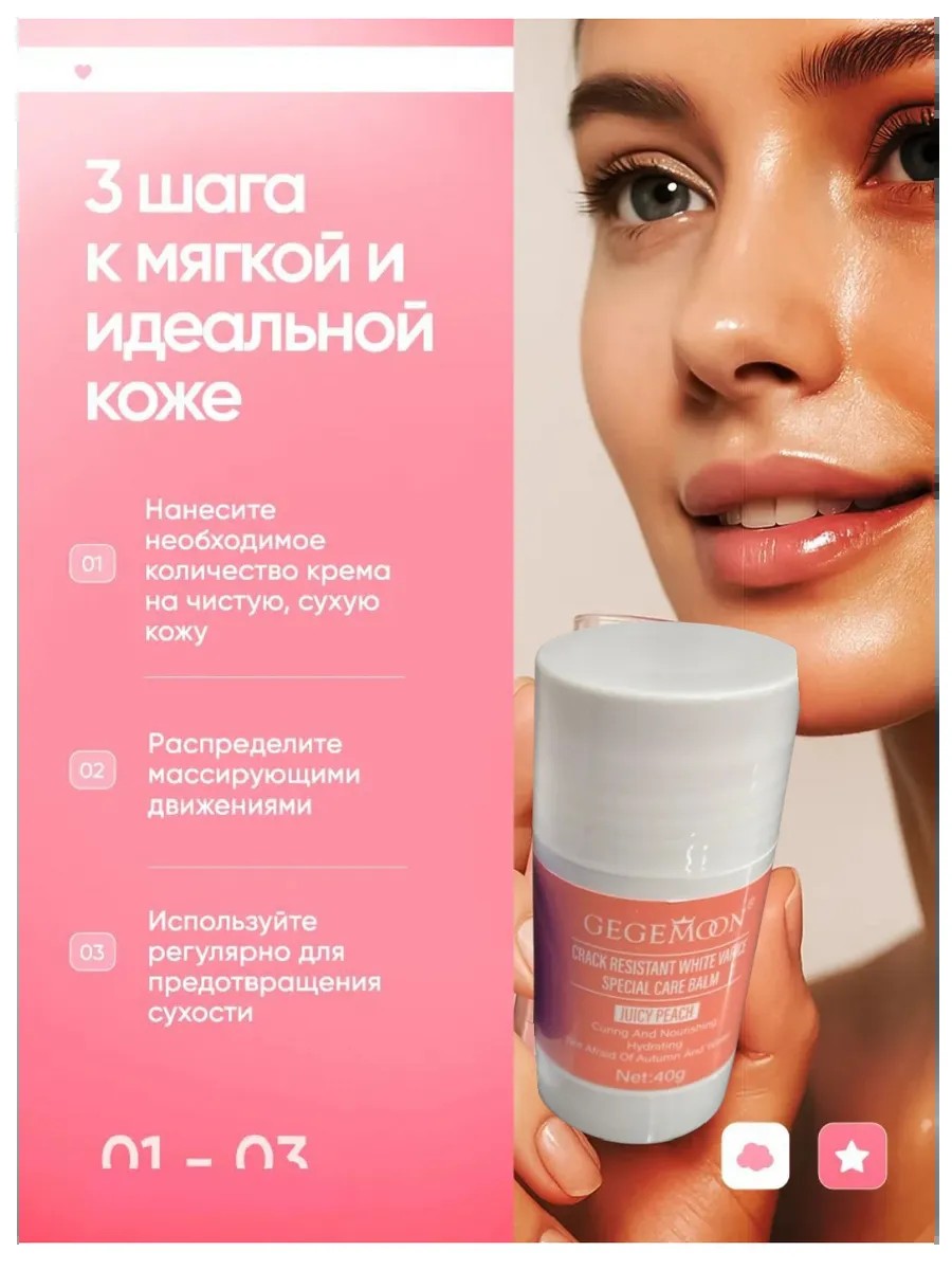 Высокоэффективный и удобный в использовании увлажняющий крем бальзам стик поможет быстро справиться с сухостью и микро трещинками на коже рук, ног, локтей, и других участков тела.Мультифункциональный бальзам стик также подойдет для ухода за кожей губ, носогубных складок, используйте как стик для лица. Активные компоненты крем для рук мгновенно смягчают и успокаивают эпидермис, образуют защитную изолирующую пленку и укрепляют эпидермальный барьер, обеспечивая также антивозрастной уход за руками.Так же используется как крем для ног или крем для ног от трещин обеспечивает надежную защиту кожи от внешних агрессивных факторов. Крем воск от трещин придает коже гладкость, мягкость и эластичность.