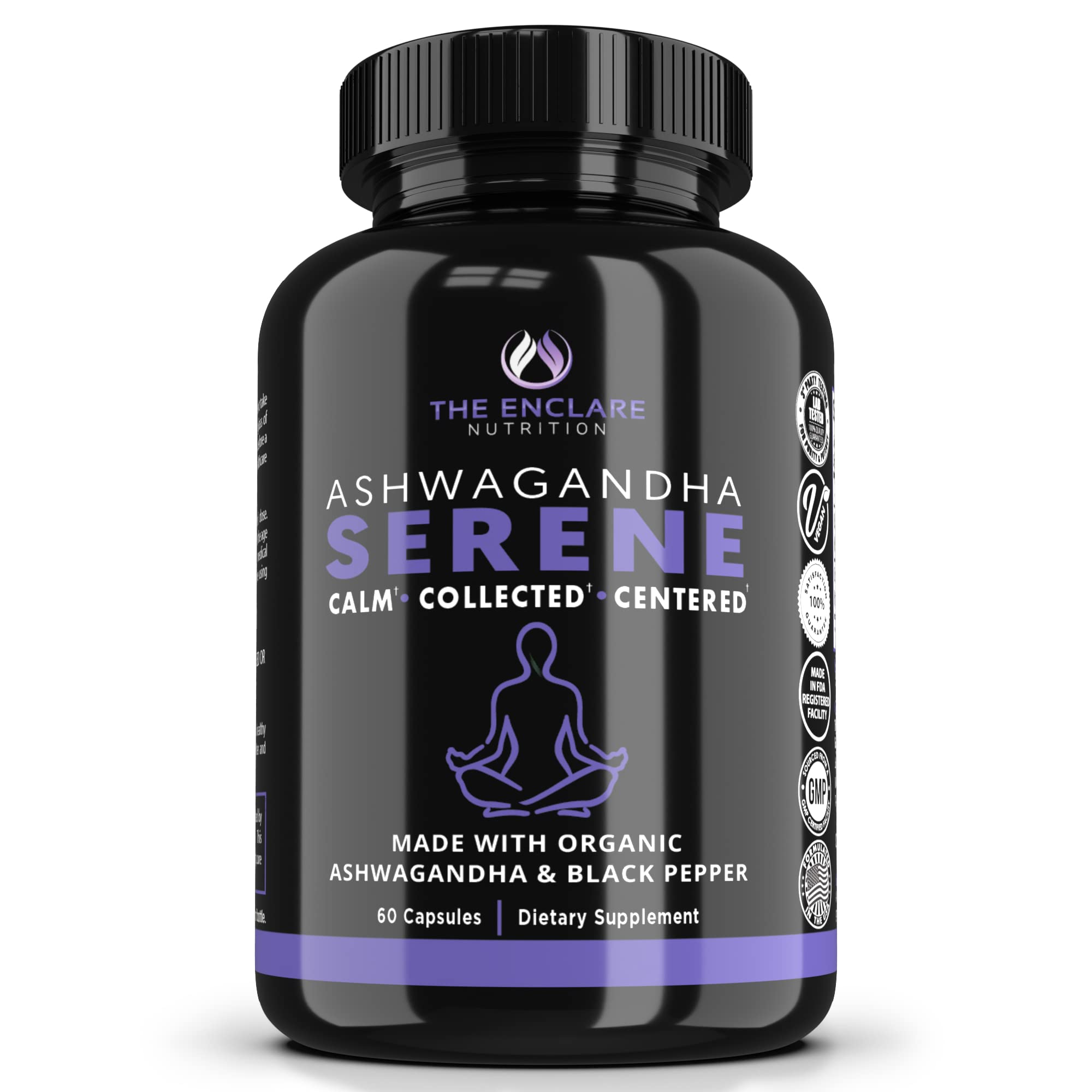 Stay Calm, Collected and Centered with ASHWAGANDHA SERENE full of natural withanolides working to reduce tension and help you relax when your demanding lifestyle gets overwhelming. Enclare's organic Ashwagandha supplement is perfect for a student stressing over exams, workaholic, executive, professional, athlete, gamer going after that next big goal busy parents juggling kids, home, work and seniors looking for that extra relaxation. Not all ashwagandha supplements are created equal. Our organic ashwagandha capsules are made with only organic ashwagandha root powder extract for maximum effectiveness and withanolide content. Plus, Organic Black Pepper Extract 10mg for increased absorption of up to 2000 according to studies. Making our Organic Ashwagandha with Black Pepper 1300mg superior to non pure ashwagandha that comes from leaves and or stems. We use only the part of the ashwagandha plant that is most beneficial. Enclare Ashwagandha SERENE contains no fillers, binders, leaves, stems, and is Gluten-Free, Non-GMO, Dairy Free, Vegan Friendly and works well with any diet. Ashwagandha is an ancient Ayurvedic herb used to combat fatigue for centuries. A potent adaptogenic herb from India, extra strength Ashwagandha helps the body adapt to different stresses. According to a study, ashwagandha herb is proven to promote enhanced focus and energy. Natural Ayurveda ashwagandha organic herbal dietary supplement is great to: Help You Relax and Unwind Help You Enjoy Peaceful and Refreshing Sleep Enhance Energy and Endurance Improve Focus and Brain Function Support Thyroid Health Help Improve Memory and Concentration Support Muscle Strength Fertility Help You De-Stress Promote Relaxation These statements have not been evaluated by the Food and Drug Administration. This product is not intended to diagnose, treat, cure, or prevent any disease. FEEL SAFE SECURE WITH OUR NATURAL Ashwagandha For Men Women Made In The USA With Highest Quality Standards And Premium Vegetarian And Organic Ingredients, Using GMP Standards 3rd Party Tested. This Maximum Strength Ashwagandha Supplement For The Brain Is Vegan, Non-GMO, Gluten Free Keto Paleo friendly Perfect For Any Diet And Has A 90 Day Guarantee. Not Happy With Our Herbal Stress Support Supplement, Mood Support Supplement and Sleep Supplement? Contact Enclare directly. ENHANCE YOUR MENTAL CLARITY: A Focus Supplement That Helps You Improve Concentration, De-stress, And Promotes Relaxation. A Calm And Centered Mind Boosts Mental Clarity. Adding Ashwagandha Supplements To Your Daily Routine May Promote Wellbeing And Vitality, While Reducing Tension, Supporting A Healthy Stress Response, A Positive Mood, And Memory. Pair Enclare Serene With Enclare Intellect, Enclare Mushrooms, Enclare Stamina And, Enclare Sculpt. YOUR PEACEFUL AND RESTFUL SLEEP SOLUTION: Ashwagandha Powder Supplement Natural Sleep Aid Helps Your Body Relax So You Fall Asleep Faster, Feeling More Relaxed And With Less Worry And, Wake Up More Refreshed. Ashwagandha Pills Support Restorative Rest And Healthy Immunity. Natural Ashwagandha Root Is An Adaptogenic Herb Which Can Help Balance Thyroid Hormones, And Adrenal Fatigue Stress. Pair Enclare Serene With Enclare Thyroid Harmony And Enclare Sleep Paradise. ENERGY, FOCUS, MEMORY SUPPORT ASHWAGANDHA: Just 2 Daily Capsules Of Our High Potent 1300mg Ashwagandha Supplement Offers Superior Adaptogens And Multiple Benefits For Brain Support And Body Rebalancing. Ashwagandha Naturally Boosts Energy and Supports Immunity. India Ashwaganda Can Help You Navigate Daily Challenges and Stresses. Perfect For Workaholics, Students, Professionals, Athletes, Executives, Busy Parents And Seniors. WHEN YOU NEED TO RELAX, BE CALM, COLLECTED AND CENTERED: Take Enclare Serene Ashwagandha Made From Pure Organic Ashwagandha Root Extract Without Leaves Or Stems For Maximum Effectiveness And Withanolide Concentration. Enhanced With Organic Black Pepper BioPerine For Superior Absorption. The Perfect Natural Solution For Your Daily Serenity. Made In The USA With Non-GMO, No Fillers Or Binders. Our Ashwagandha Capsules Are Convenient, Easy-to-swallow And Carry With You On-The-Go.
