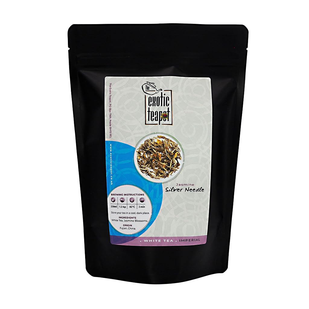 The Exotic Teapot - Jasmine Silver Needle White Tea Large 100g Pouch Imperial Fujian Tea Naturally Scented with Jasmine flowers 100 g Pouch (Pack of 1)