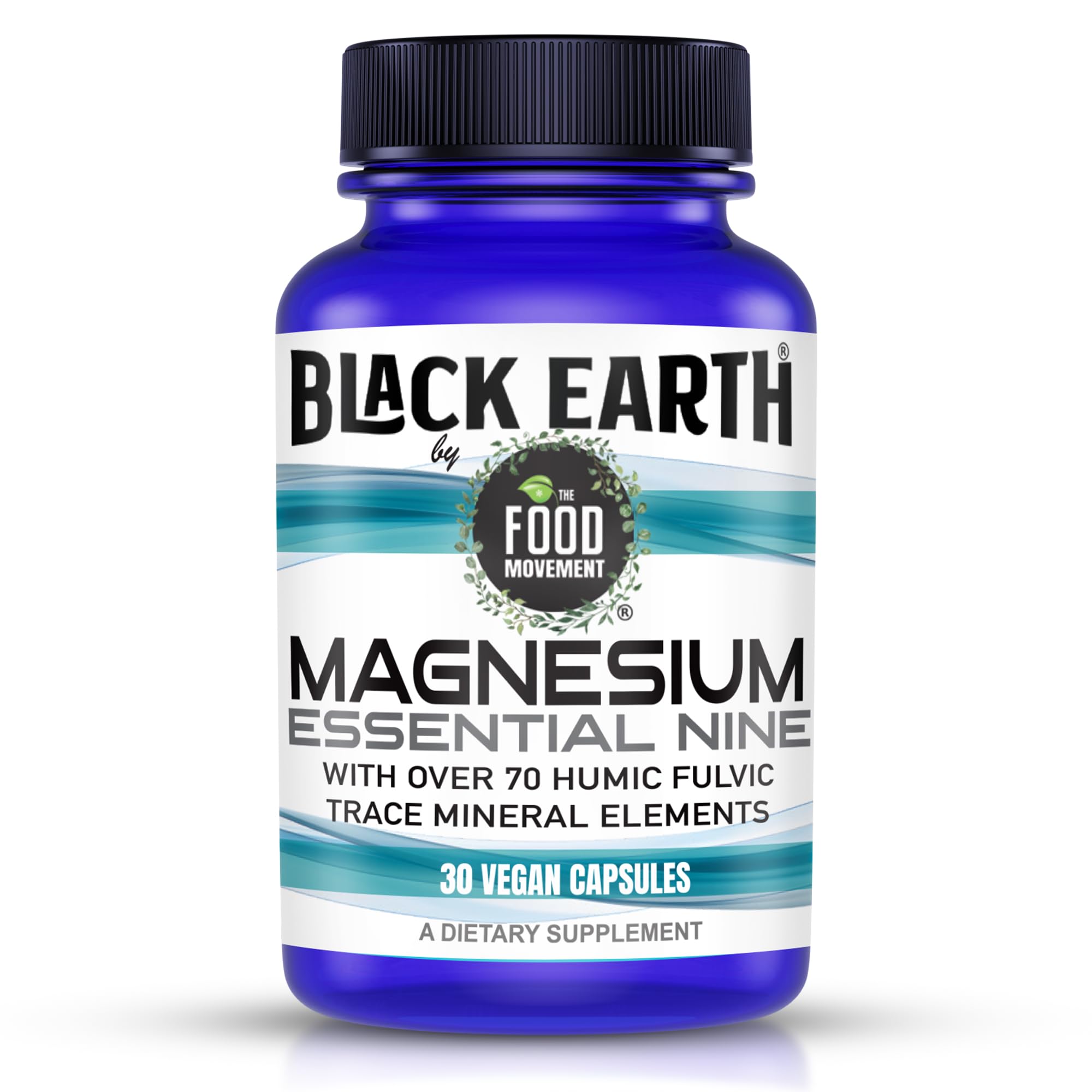 Introducing Black Earth Magnesium Essential Nine by The Food Movement Co., a groundbreaking formula designed to support relaxation and overall well-being. This unique product features a Magnesium Blend with 9 bioactive forms, ensuring you receive the comprehensive benefits of this essential mineral. Each of the 30 vegan capsules is crafted with plant-based nutrition in mind, making it suitable for those adhering to a vegan lifestyle. Our formula is rooted in a humic fulvic acid base, a natural source that enhances the bioavailability of magnesium, ensuring that your body absorbs and utilizes it effectively. The inclusion of chelated magnesium, in forms such as magnesium glycinate, magnesium citrate, and magnesium malate, ensures that Black Earth Magnesium Essential Nine supports healthy muscle function and bone health, while also helping to alleviate muscle cramps. The Food Movement Co. understands the importance of quality and efficacy, which is why this product is crafted in a GMP-certified facility. This guarantees that every capsule meets the highest standards of safety and purity. Our magnesium blend includes highly absorbable forms like magnesium taurinate and magnesium amino acid chelate, ensuring that you receive the full spectrum of benefits this mineral has to offer. Moreover, with the addition of magnesium carbonate, magnesium hydroxide, and magnesium fulvate humate, this product provides a multi-form approach, catering to various bodily needs. The trace minerals included further enhance the product's ability to support relaxation and overall health. Whether you're looking to support bone health or enhance your body's ability to relax and unwind, Black Earth Magnesium Essential Nine is your go-to choice. Trust The Food Movement Co. to deliver a scientifically formulated product that aligns with your health goals. Experience the synergy of 9 bioactive forms of magnesium and embrace a new level of wellness with every capsule.GMP Certified Quality: Produced in a GMP-certified facility, Black Earth Magnesium ensures the highest quality standards in delivering a potent magnesium blend that supports relaxation, bone health, and muscle function, with no compromise on safety. Supports Relaxation and Muscle Health: This supplement supports relaxation and helps alleviate muscle cramps, thanks to its highly absorbable magnesium blend, featuring magnesium glycinate and magnesium amino acid chelate, promoting healthy muscle function. Plant-Based Nutrition: Our magnesium blend is rooted in plant-based nutrition, providing a sustainable source of essential minerals such as magnesium glycinate, magnesium citrate, and magnesium malate, all working synergistically for overall well-being. Trace Minerals for Enhanced Absorption: Infused with trace minerals and a humic fulvic acid base, these vegan capsules are designed to support bone health and ensure that the magnesium blend, including magnesium fulvate humate, is efficiently utilized by the body. Comprehensive Magnesium Blend: Our Black Earth Magnesium capsules feature a multi form magnesium blend with nine bioactive forms, including amino acid chelated magnesium, magnesium bisglycinate, and Sucrosomial magnesium, ensuring optimal absorption and efficacy.