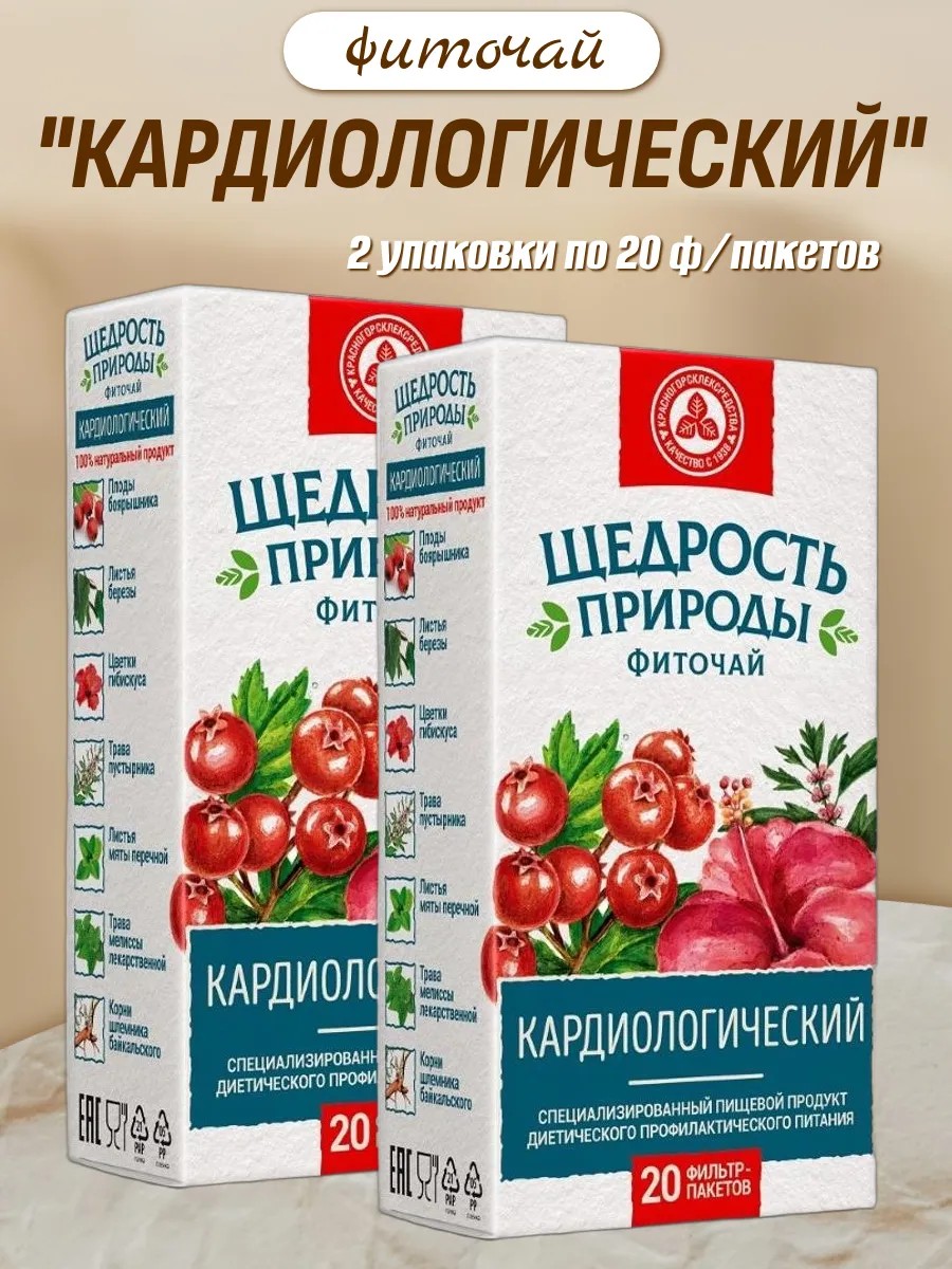 Фиточай "Кардиологический" специализированный пищевой продукт, разработанный для диетического профилактического питания. Его состав включает в себя натуральные известные всем и веками проверенные травы и плоды боярышника, листья березы, цветки гибискуса, трава пустырника, листья мяты перечной, трава мелиссы лекарственной и корни шлемника байкальского.
