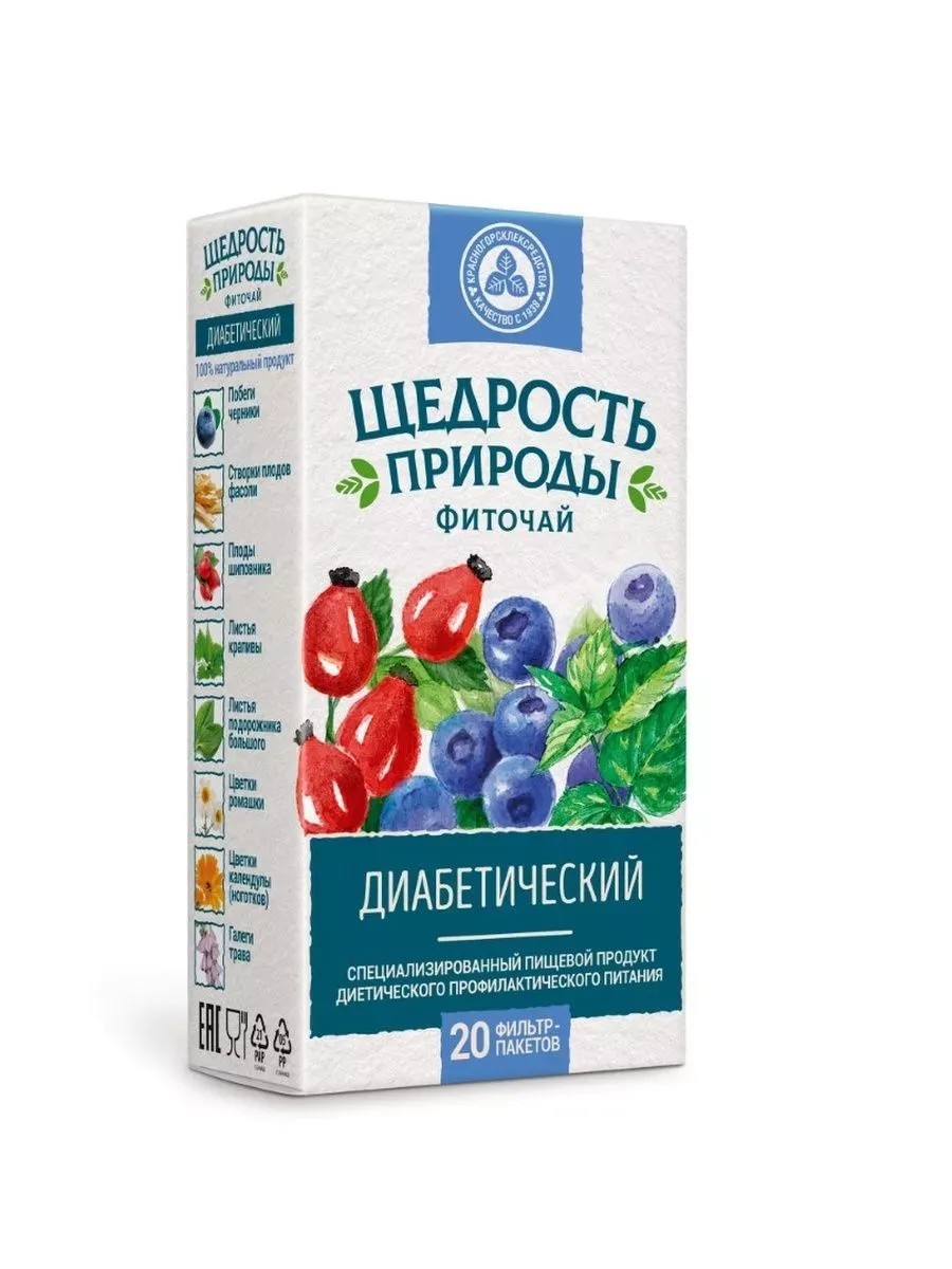 ЩЕДРОСТЬ ПРИРОДЫ ФИТОЧАЙ ДИАБЕТИЧЕСКИЙ - специализированный пищевой продукт диетического профилактического питания.• Рекомендован для профилактики и в комплексной терапии сахарного диабета I и II типа• Способствует нормализации углеводного обмена• Способствует повышению чувствительности тканей к инсулину• 100% натуральный продукт1 фильтр-пакет фиточая залить 1 стаканом (200 мл) кипятка, настоять 15 минут, отжать фильтр-пакет, довести объем до 200 мл.Рекомендации по применению: взрослым no 1 стакану 2 раза в день во время еды.Продолжительность приема - 1 месяц.При необходимости прием можно повторить.