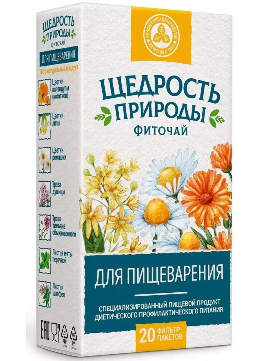 Щедрость природы - фиточай для пищеварения.Специализированный пищевой продукт диетического профилактического питания• Рекомендован для профилактики заболеваний желудочно-кишечного тракта• Способствует устранению спазмов желудочно-кишечного тракта• Способствует улучшению секреторной и моторной функции желудка и двенадцатиперстной кишки• 100% натуральный продукт1 фильтр-пакет залить 1 стаканом (200 мл) кипятка, настоять 15 минут, отжать фильтр-пакет или процедить, довести объем до 200 мл.Рекомендации по применению: взрослым по 1 стакану 2 раза в день во время еды. Продолжительность приема - 1 месяц. При необходимости прием можно повторить.