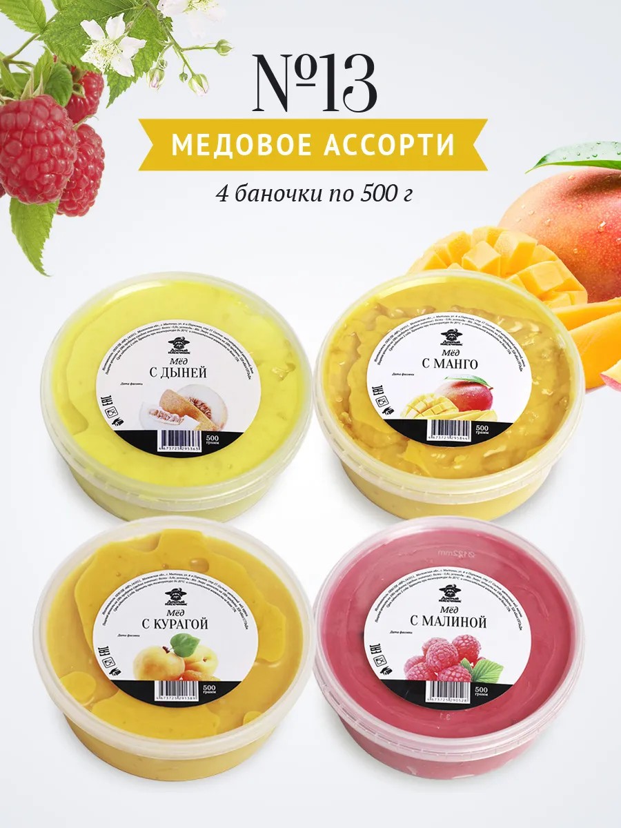 | Состав | Натуральный мед с дыней 500г; Натуральный мед с манго 500г; Натуральный мед с курагой 500г; Натуральный мед с малиной 500г |