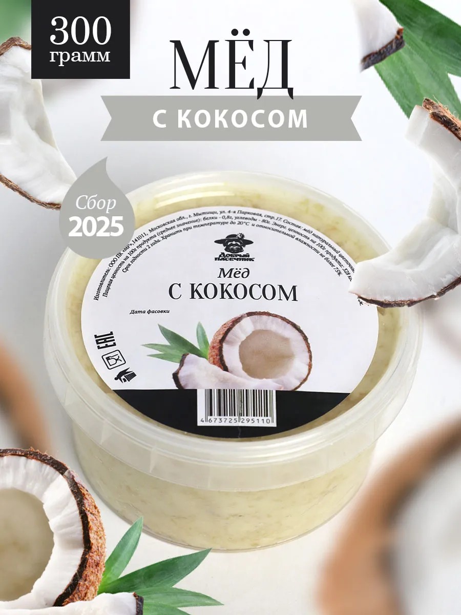 Мед с кокосом 300 г, укрепление иммунитета, ЗОЖ