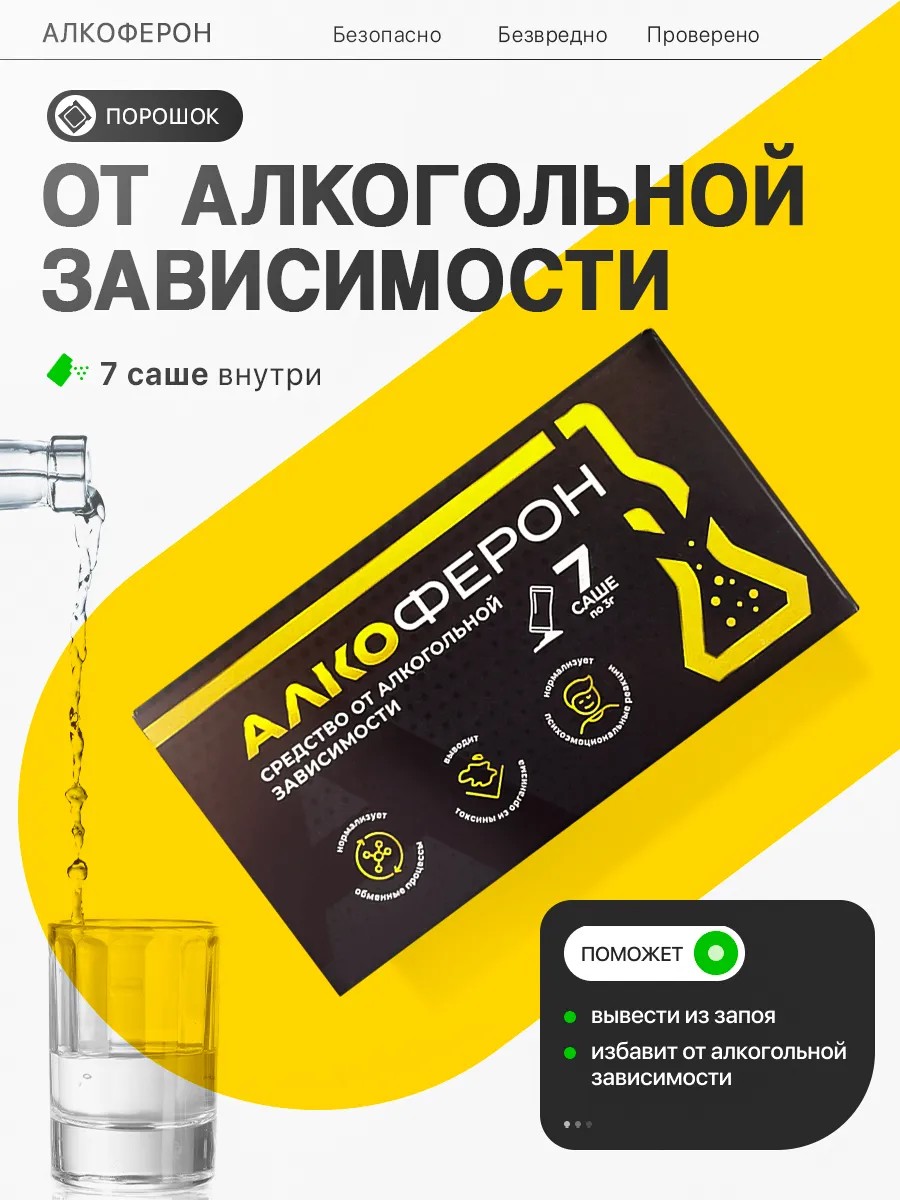Алкоферон– это инновационный продукт, разработанный для борьбы с алкогольной зависимостью, очищение организма и снятия симптомов похмелья. Саше для алкоголя обладают высокой эффективностью и помогают людям освободиться от алкогольной зависимости, восстановить здоровье и улучшить качество жизни. Саше от похмелья Алкостоп разработаны с использованием передовых технологий и содержат натуральные ингредиенты, которые помогают справиться с алкогольной зависимостью без побочных эффектов. Регулярная чистка организма помогает избавиться от токсинов и улучшить общее самочувствие. В составе средства от алкогольной зависимости входят только натуральные компоненты. Трезвин содержит компоненты, которые оказывают благоприятное воздействие на организм, помогая снизить желание к алкоголю и облегчить симптомы похмелье, происходит очистка организма и очистка печени. Экстракт травы золототысячника имеет успокаивающее и антистрессовое действие. Экстракт плодов боярышника поддерживает нормализацию сердечно-сосудистой системы, снижает артериальное давление. Пустырник обладает успокаивающим и седативным действием, помогает справиться с тревогой, раздражительностью. Препарат от алкоголизма помогает справиться с алкогольной зависимостью, снижает желание к употреблению алкоголя. Кроме того, детокс для очищения организма улучшает общее самочувствие и способствует восстановлению организма. Саше помогают снять симптомы похмелья, такие как головная боль, тошнота и усталость. Антипохмелин не содержит вредных химических веществ и искусственных добавок, что позволяет принимать детокс без опасения побочных эффектов. Алкоферон от похмелья - это витаминно-минеральный комплекс, который помогает людям избавиться от вредной привычки и начать новую жизнь без алкоголя. Эффективность порошка выше, чем другие препараты, такие как: алкобарьер или даже таблетки от алкоголизма.Таблетки для печени взрослым принимать 1-2 раза в день независимо от приема пищи. Продукт имеет противопоказания: беременность, период лактации, детский возраст. Выберите блокатор алкогольной зависимости Алкоферон и дайте себе шанс на здоровую и счастливую жизнь. Откажитесь от дорогостоящих лекарств и доверьтесь естественным ингредиентам, которые помогут вам преодолеть алкогольную зависимость.