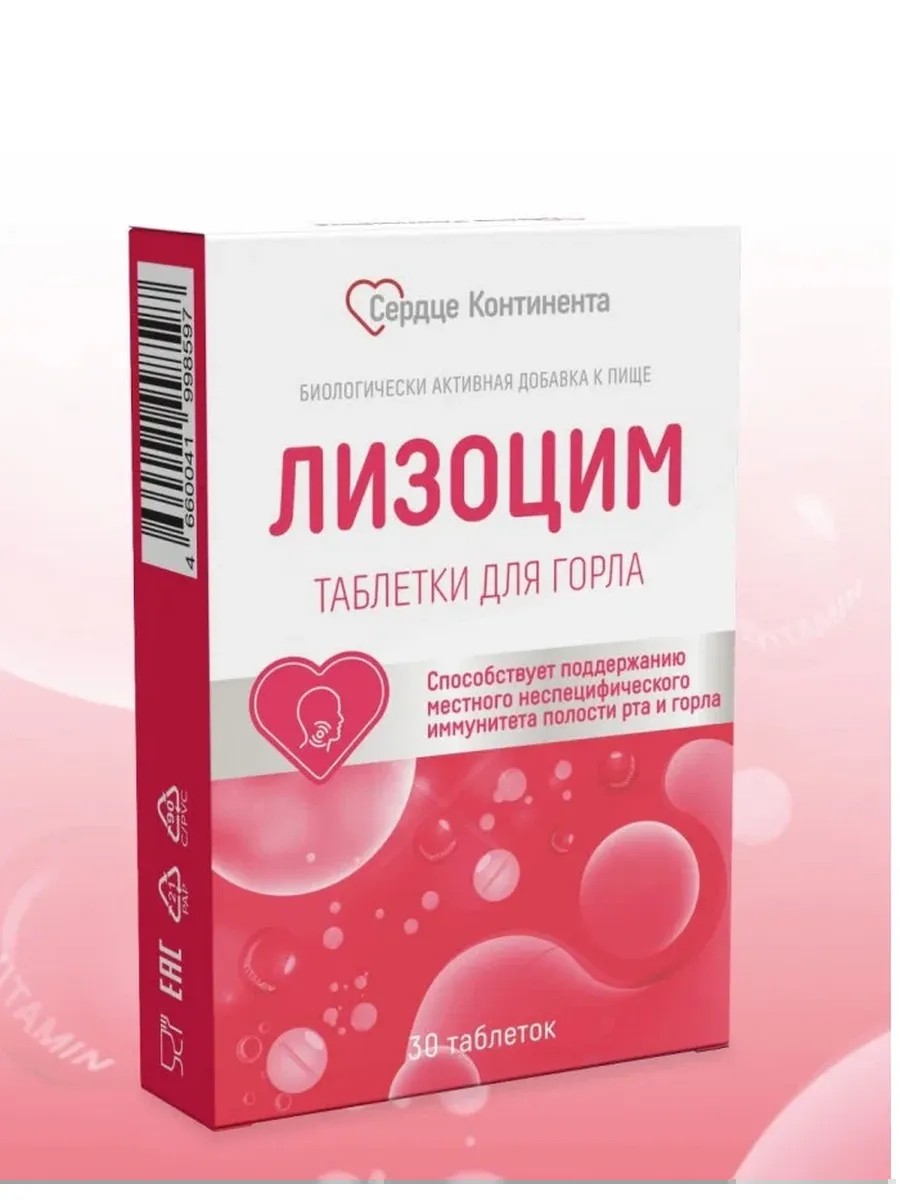 Состав, форма выпуска и упаковка Таблетки - 1 таб. : Активные вещества: Инулин, лизоцим (мурамидаза), витамин В6; Вспомогательные вещества: Диоксид кремния аморфный, тальк пищевой, жирные кислоты, ароматизатор "мятный", магния стеарат. Содержание активных веществ в 1 таблетке: Инулин 414 мг, Витамин В6(пиридоксина гидрохлорид) 2 мг; Лизоцим (мурамидаза) 20 мг. Характеристика Комплекс, содержащий мурамидазу (лизоцим), витамин В6 и инулин. Компоненты комплекса лизоцим (фермент белковой природы, обладающий противовоспалительными и антисептическими свойствами): воздействует на бактерии, грибы и вирусы; предотвращает колонизацию желудочно-кишечного тракта патогенными микроорганизмами; принимает участие в регуляции местного неспецифического иммунитета. витамин В6: защищает слизистую оболочку полости рта (проявляет антиафтозный эффект); участвует во многих обменных процессах. инулин: улучшает углеводный и липидный обмен; положительно влияет на восстановление кишечной микрофлоры; ускоряет очищение организма от шлаков и вредных веществ; благоприятствует укреплению иммунной системы; способствует нормализации уровня сахара в крови; помогает справиться с чрезмерным аппетитом. Комплекс рекомендуется принимать в целях профилактики, а также в качестве дополнения к терапии: инфекционно-воспалительных заболеваний слизистой оболочки полости рта, десен и гортани; острых и хронических рецидивирующих инфекций ротоглотки и верхних дыхательных путей; снижения местного иммунитета в условиях воздействия неблагоприятных факторов (сложная экологическая обстановка, дефицит питательных веществ, прием антибиотиков, переохлаждение, переутомление, курение, злоупотребление алкоголем и т. п. ). Рекомендуется Рекомендуется в качестве биологически активной добавки к пище-источника лизоцима, витамина В6, инулина, улучшающих функциональное состояние верхних дыхательных путей. Противопоказания к применению Индивидуальная непереносимость компонентов, беременность, кормление грудью. Способ применения и дозы Взрослым, принимать по 1 таблетке 3 раза в день во время еды, медленно рассасывая таблетку во рту, не разжевывать и не запивать. Продолжительность приема — до 10 дней. При необходимости прием можно повторить.