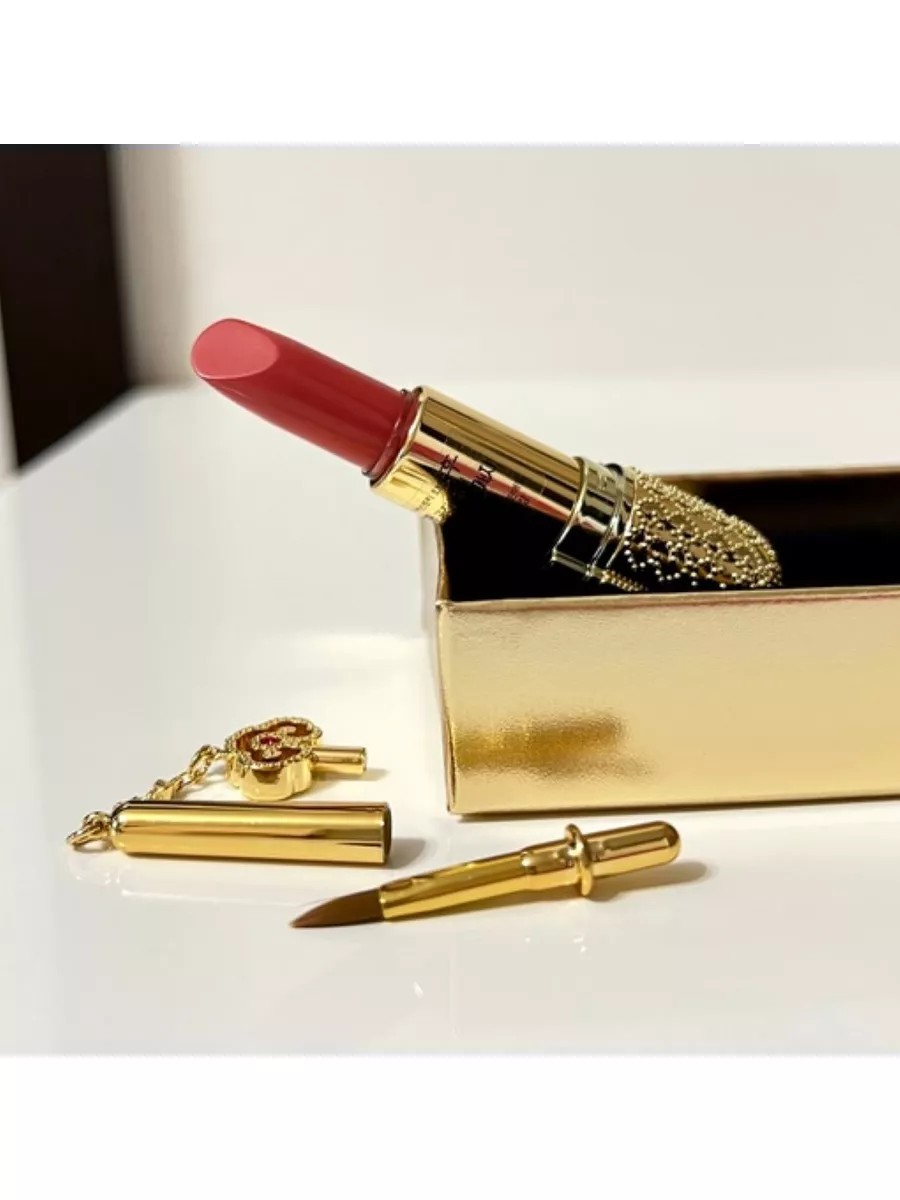 This lipstick visually plumps lips without accentuating marionette lines. The finish: a vibrant, moist, even coating that doesn't feather or crease. It feels pleasant on the lips without drying out the delicate skin, leaving no stickiness or greasy shine. This luxury makeup product doesn't have a strong scent or taste and doesn't clash with other cosmetics. The elegant case is made of durable material that resists scratches, fading, or peeling. The functional lipstick brush comes with a separate case that magnetically attaches to the lipstick case, preventing it from staining your purse or makeup bag after use. A black velvet backing adds a touch of gloss to the gift packaging. This lipstick will be a great gift for your mom, loved one, or friend for any occasion: birthday, New Year, March 8th, or just because.