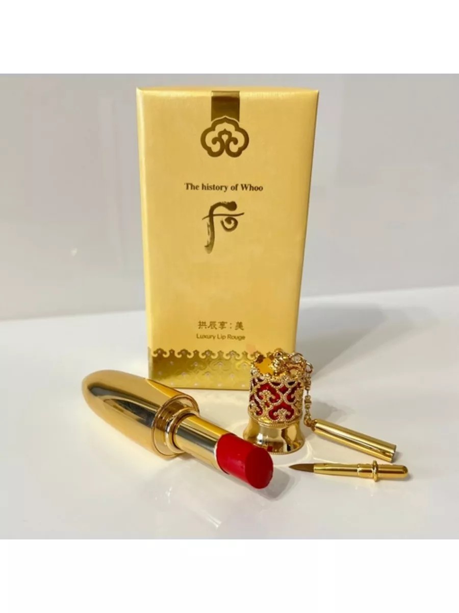 The History of Whoo Luxurious, unique lipstick shade Royal Red No. 45 (6g) Gongjinhyang Mi Luxury Lip Rounde - a luxury lipstick - redefines beauty, embodying the modern concept of royal beauty. This lipstick instantly and softly applies to lips, giving them intense, vibrant color and providing ultra-moisturizing hydration in just one stroke, thereby helping to improve the appearance of lips, making them bright and smooth. Wearable classic rich color complements elegant makeup. Functional Korean luxury cosmetics contain collagen and amino acids and have a rejuvenating effect to smooth out wrinkles. Lipstick moisturizes, nourishes the skin of the lips, slowing the aging process. Luxurious lipstick applies elastically to lips, creating a bright, rich color with a moist and even coverage.