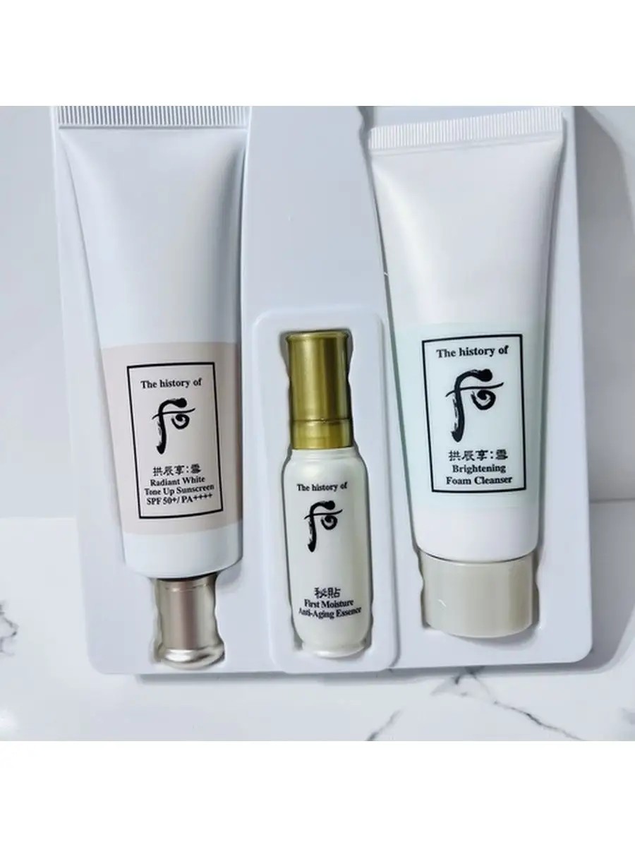 Бьюти-бокс содержит: 1. Солнцезащитный крем SPF50+PA++++ (50мл) Gongjinhyang Radiant White Tone-Up Sunscreen. 2.Средство для удаления загрязнений с кожи лица (40мл) Brightening Foam Cleanser. 3.Сыворотка-активатор (8мл)First Moisture Anti-Aging Essence - Концентрированная сыворотка - активатор наносится сразу после умывания, пробуждает и активизирует последующий уход.