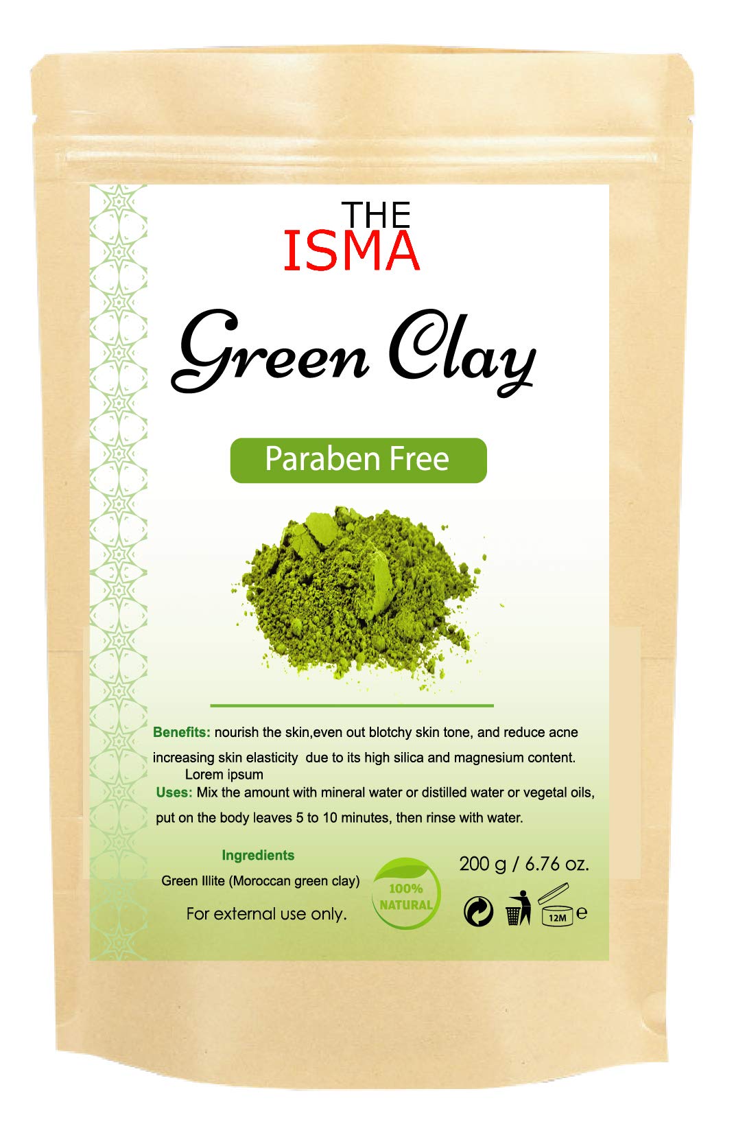 Directions for use: Mix the required amount with mineral water, distilled water, or vegetable oils. Apply the mixture to the face and body for 5 to 10 minutes, then rinse with water.Products: 100 pure kaolin - Moroccan clay. Available sizes and types: 100g green clay, 100g red clay, 100g white clay and 100g Ghassoul powder 200g green clay, 200g red clay, 200g white clay and 200g Ghassoul powder and available in 200g jars of white, red, green, and Ghassoul clay. History: These Moroccan healing clays have been used for centuries as a cleanser and remedy. 100 vegan with no artificial additives. Application: Mix the required amount with mineral water, distilled water, or vegetable oils. Apply to the body for 5-10 minutes, then rinse with water. Please refer to the specific product application instructions for best results. Benefits: Nourishes the skin, evens out uneven skin tone, and reduces acne, increg skin elasticity thanks to its high silica and magnesium content. Ghassoul powder helps eliminate impurities, cleanse, and detoxify.THE ISMA Masque facial à l'argile Kaolin 100 naturelle, sans paraben, nettoyage en profondeur des pores (sac de 200 g, vert)DESCRIPTION DU PRODUIT Mode d'emploi : Mélangez la quantité avec de l'eau minérale ou de l'eau distillée ou des huiles végétales. Mettez les feuilles du visage et du corps 5 à 10 minutes, puis rincez à l'eau.Produits : kaolin 100 pur - Argile marocaine. Tailles et types d'argile disponibles : 100 g d'argile verte, 100 g d'argile rouge, 100 g d'argile blanche et 100 g de poudre de Ghassoul, 200 g d'argile verte, 200 g d'argile rouge, 200 g d'argile blanche et 200 g de poudre de Ghassoul et disponible sur pot de 200 g de blanc, rouge, vert et Ghassoul. Histoire : ces argiles de guérison marocaines sont utilisées depuis des siècles comme nettoyant et remède. 100 végétalien sans additifs artificiels. Application : mélangez la quantité avec de l'eau minérale ou de l'eau distillée ou des huiles végétales, mettez les feuilles du corps 5 à 10 minutes, puis rincez à l'eau. Veuillez vous référer à la méthode d'application de produits spécifiques pour plus de résultats. Avantages : nourrit la peau, unifie le teint tacheté et réduit l'acné, augmentant l'élasticité de la peau grâce à sa haute teneur en silice et en magnésium. La poudre de Ghassoul aide à éliminer les impuretés, nettoyer et détoxifier.