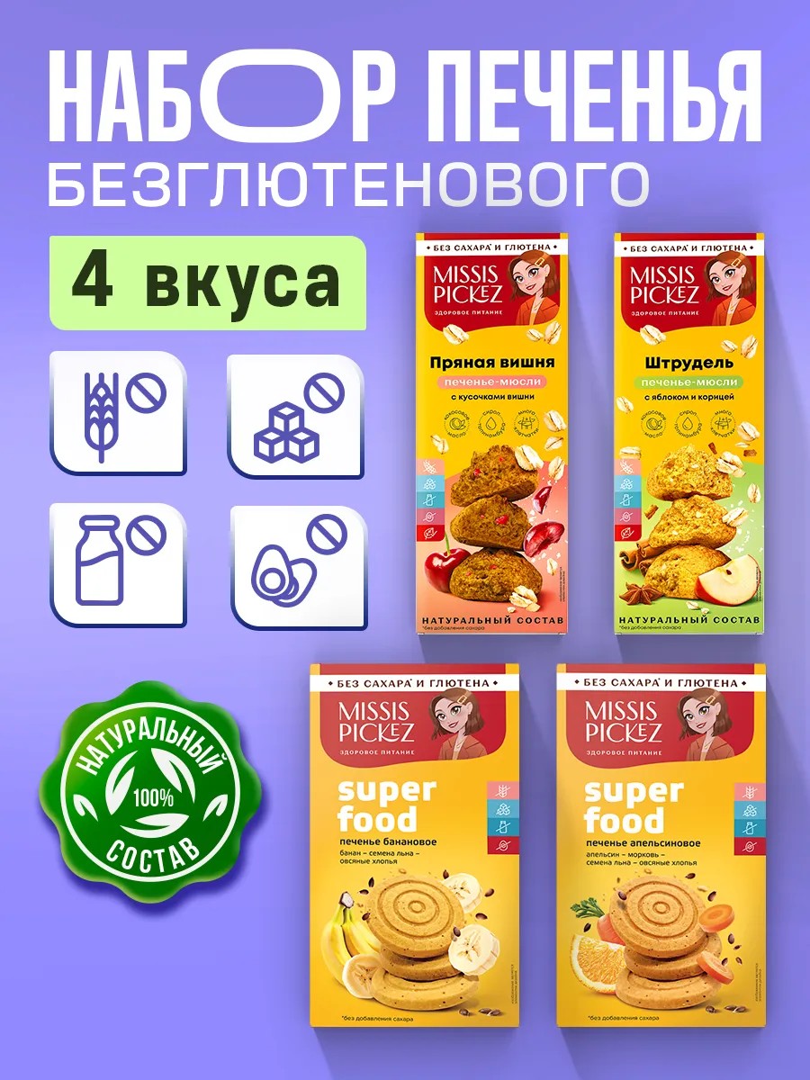 | Комплектация | печенье апельсиновое; "Штрудель" с яблоком и корицей; печенье банановое; "Пряная вишня" с кусочками вишни |