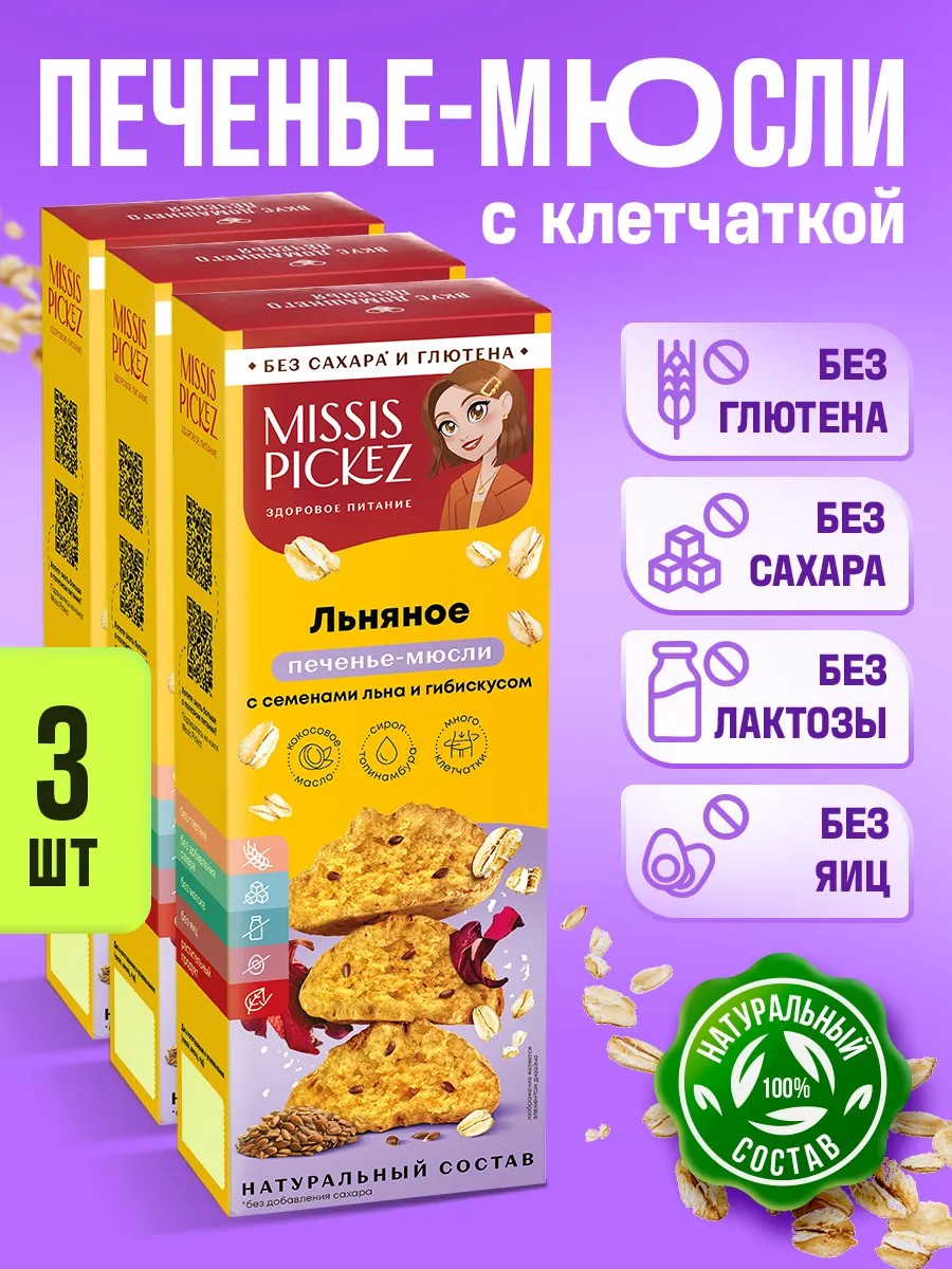 Печенье-мюсли Льняное с семенами льна и гибискусом "Missis Pickez", вкусная сладость для любителей здорового питания.