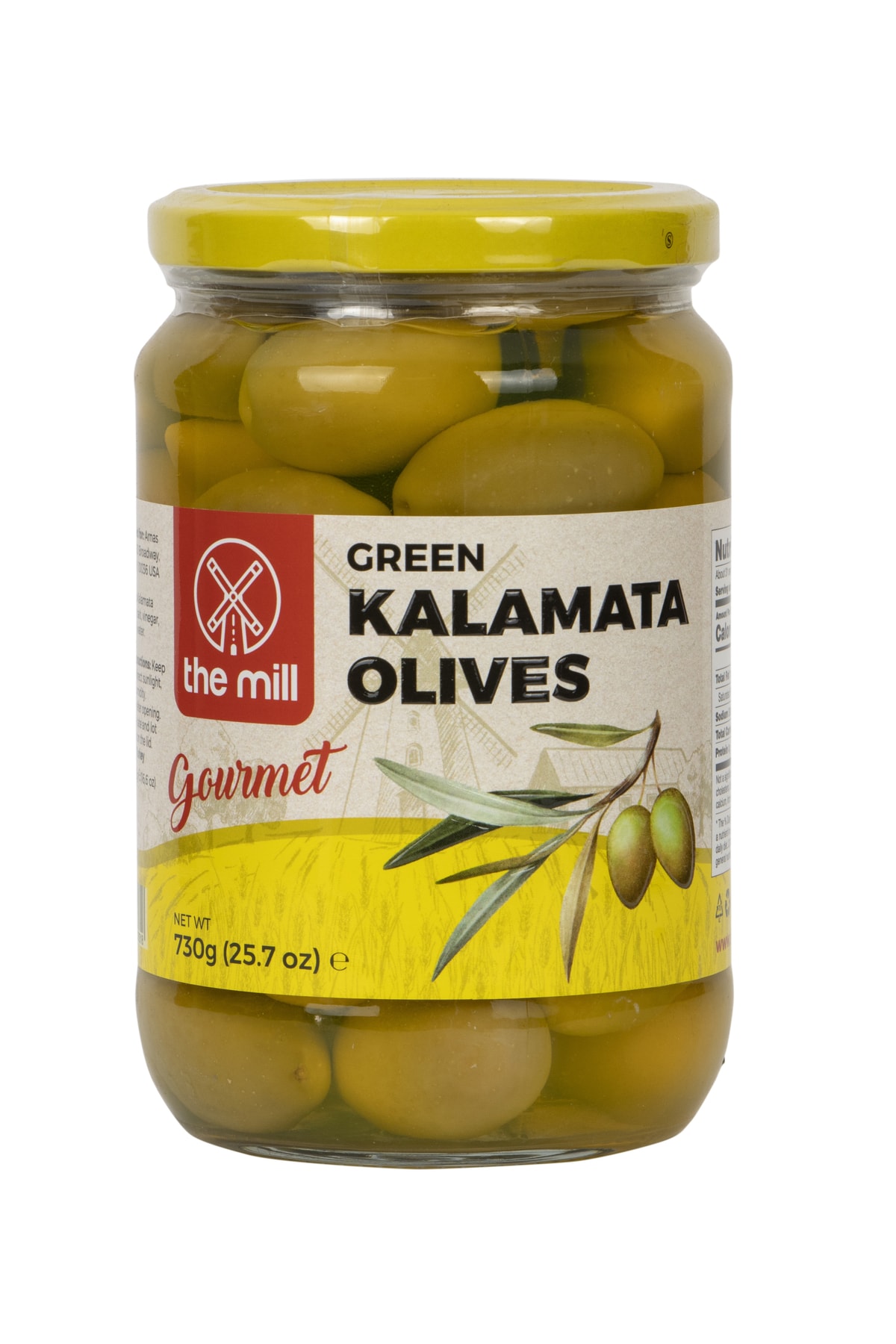 The Mill Gourmet Green Kalamata Olives 730 g Glass Jar - Pitted - In Brine -Kalamata Type Processing Method- Rich in Oleic Acid - Smooth and Green Color - Pasteurized