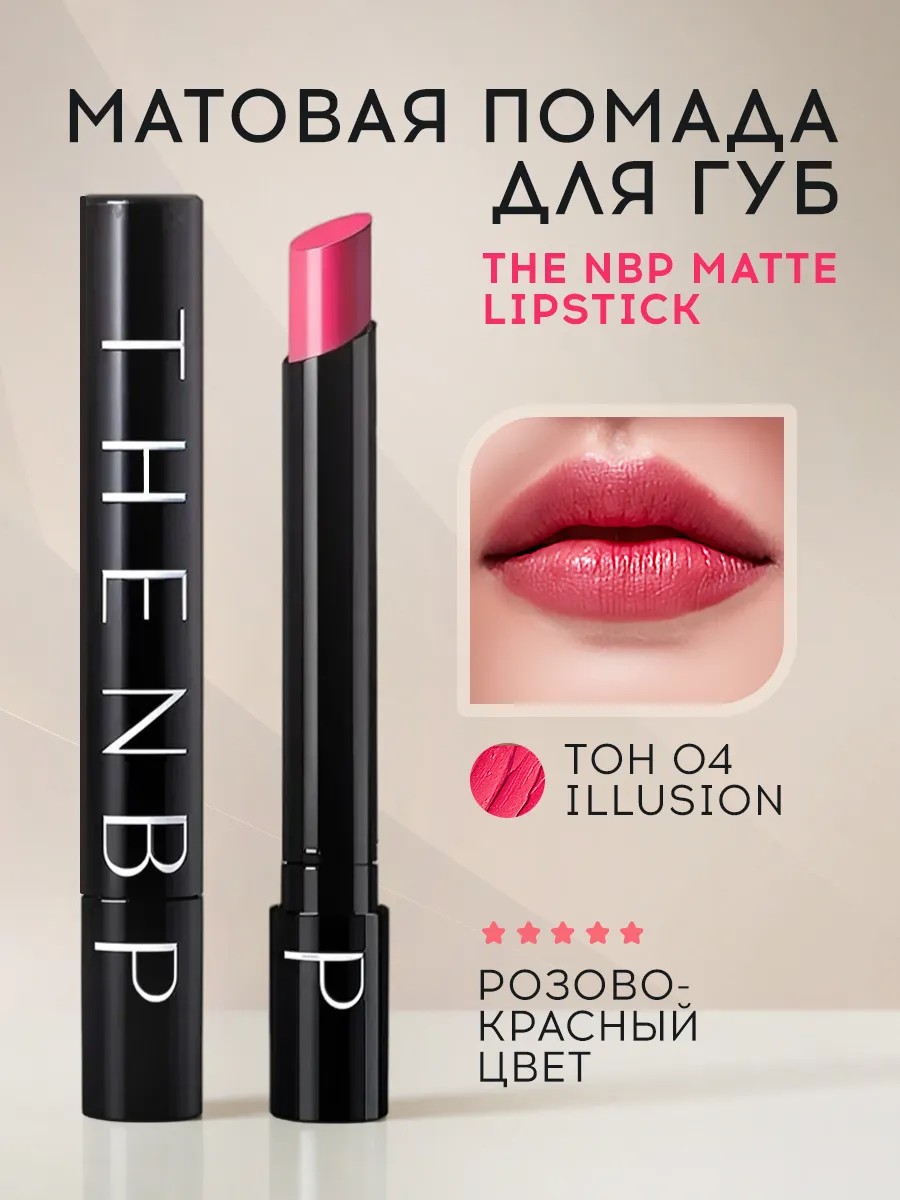 Матовая помада для губ THE NBP Matte Lipstick в оттенке Illusion — это идеальное сочетание элегантного розово-красного цвета с прохладным оттенком пурпурно-розового. Легкая, невесомая текстура помады мягко ложится на губы, даря ощущение комфорта и сохраняет стойкость покрытия в течение всего дня. Благодаря компактной форме, помада всегда будет под рукой, чтобы подчеркнуть вашу женственность и добавить образу изысканности и очарования. Создайте нежный, утонченный макияж в стиле «light soft mood», наполненный чувственностью и деликатной красотой вместе с оттенком Illusion.
