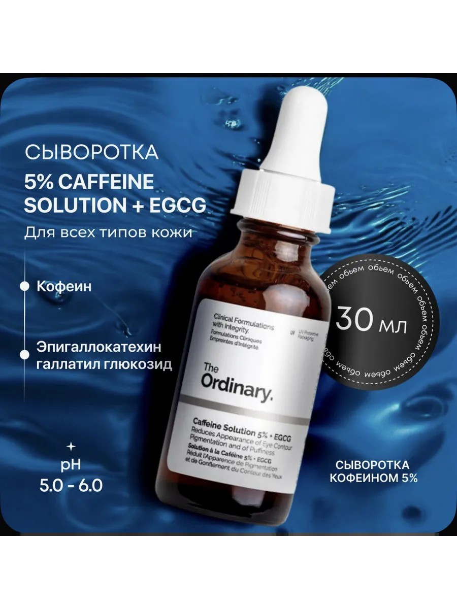 Сыворотка для кожи вокруг глаз Канада. Продукт сертифицирован, 100% оригинал! The Ordinary Caffeine Solution 5% + EGCG комплексно тонизирует, устраняет тусклость и отёчность. Избавляет от тёмных кругов, разглаживает и подтягивает. Легкая формула содержит чрезвычайно высокую концентрацию кофеина. Осветляющая сыворотка ординари стимулирует микроциркуляцию век, сужает сосуды и снимает отеки. Галлат эпигаллокатехина, полученный из листьев зеленого чая, оказывает мощный антиоксидантный эффект, укрепляет и замедляет процессы старения. Уровень pH сыворотки колеблется от 4,5 до 5,0. Гелевая текстура легко распределяется по коже, после впитывания оставляет матовый финиш. Рекомендации по применению: 1-2 капли наносить утром и вечером массирующими движениями.