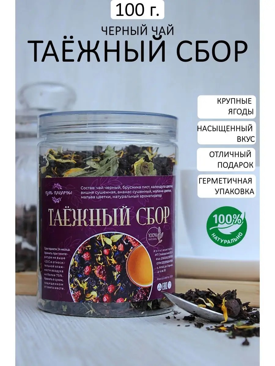 Таёжный сбор — это натуральный черный чай с добавками растений и ягодами из российской тайги. Благотворно влияет на здоровье и укрепляет иммунитет. Сушенные ягоды и листья в полной мере сохранили витамины и аромат тайги. Этот невероятный сбор не оставит равнодушных. Такой черный чай считается напитком охотников и лесников. Обладает уникальными полезными ингредиентами в составе.