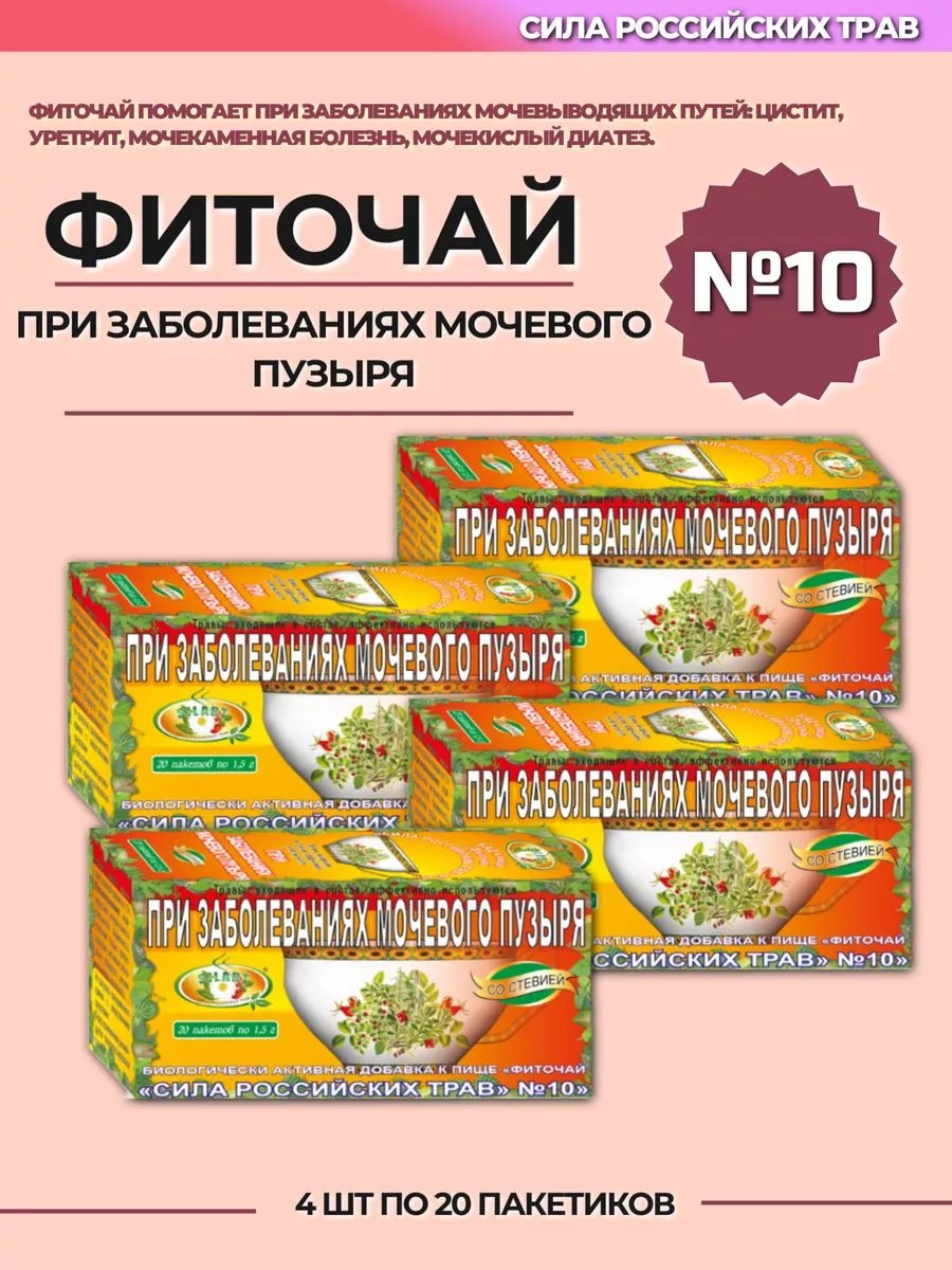 Фиточай Сила Российских трав № 10 обладает противовоспалительным, антибактериальным, мочегонным, жаропонижающим и успокаивающим действием; дезинфицирует мочевые пути. Воздействие состава обусловлено уникальным соотношением частей, которые в сумме являются необходимым энергетическим аккордом, нейтрализующим причину патологии мочевого пузыря. Брусника применяется при мочекаменных болезнях, при цистите, является сильным мочегонным средством.Толокнянка оказывает антисептическое, дезинфицирующее и диуритическое действие, благодаря чему мочевые пути отмываются от продуктов воспаления.Зверобой действует противомикробно, противовоспалительно, болеутоляюще, общеукрепляюще, регулирует обменные процессы в организме; эффективен при цистите, мочекаменной болезни и ночном недержании мочи.Цветы ромашки обладают противовоспалительным, болеутолящим, мочегонным, успокаивающим свойствами, расслабляют гладкую мускулатуру внутренних органов и устраняют спазм.Семя льна обладает очищающим и противовоспалительным действием, помогает от язв мочевого пузыря.Спорыш уменьшает степень кристаллизации минеральных солей, растворяет камни в почках и в мочевом пузыре, обладает мочегонным действием, усиливает фильтрационную функцию почечных клубочков, выводит токсические вещества из организма, действует общеукрепляюще и тонизирующе.Стевия обладает уникальными лечебно-профилактическими и оздоровительными свойствами, в ее состав входит много полезных для организма человека веществ: антиоксиданты-флавоноиды, минеральные вещества, витамины С,А,Е и группы В.Хвощ применяется в качестве мочегонного средства, при заболеваниях мочевыводящих путей (цистит и уретрит), успокаивает боль при каменной болезни, облегчает мочеиспускание.Шиповник - поливитаминное растение, обладает общеукрепляющим и тонизирующим действием, улучшает окислительно-восстановительные процессы в организме.Трава эхинацеи эффективна при урологических болезнях (цистит, простатит).Тысячелистник препятствует осаждению минеральных соединений и мочевых камней в почках ,нормализует обмен веществ. Фиалка действует противовоспалительно, мочегонно и депуративно, особенно при воспалении мочевого пузыря, мочекислом диатезе и мочекаменной болезни.Фиалка действует противовоспалительно, мочегонно и депуративно, особенно при воспалении мочевого пузыря, мочекислом диатезе и мочекаменной болезни.Хмель применяется при циститах и частых болезненных позывах к мочеиспусканию.Чабрец мочегонное, противовоспалительное, успокаивающим средство, применяется при цистите.