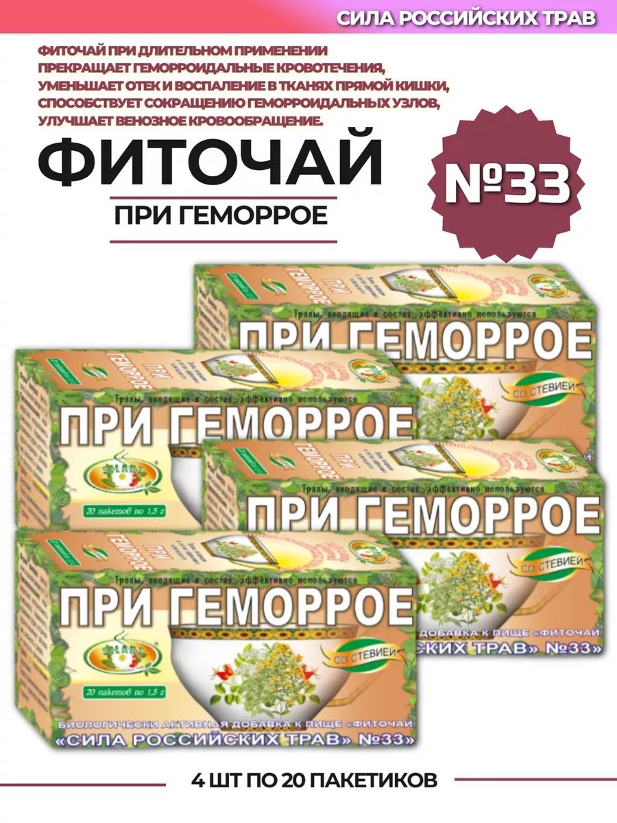 Фиточай Сила Российских трав № 33 при длительном применении прекращает геморроидальные кровотечения, уменьшает отек и воспаление в тканях прямой кишки, способствует сокращению геморроидальных узлов, улучшает венозное кровообращение. Воздействие состава обусловлено уникальным соотношением частей, которые в сумме дают необходимый энергетический аккорд, нейтрализующий разбалансированность организма, ведущую к геморрою. Восстановление нормальных энергетических характеристик организма сопровождается ликвидацией патологических изменений в дистальном отделе толстой кишки. Способ применения: 1 фильтр-пакет залить одним стаканом (200 мл) кипятка и настаивать 15 мин. Взрослым принимать по 1 стакану настоя 1 раз в день во время еды. Продолжительность приема: 1 месяц. Шиповник обеспечивает поливитаминный состав чая. Корень лопуха используется как болеутоляющее и восстанавливающее обмен веществ средство при геморрое. Считается лучшим средством, восстанавливающее обменные процессы в организме. Пастушья сумка оказывает кровоостанавливающее действие; повышает тонус гладких мышц кишечника. Зверобой способствует снятию спазма толстой кишки, укрепляет стенки капилляров, улучшает венозное кровообращение и кровоснабжение внутренних органов. Крапива снимает геморроидальные боли, используется для лечения геморроидальных кровотечений. Жостер слабительный (кору крушины) применяют как противогемморойное средство.Ромашка и тысячелистник обладают противовоспалительным, кровоостанавливающим, антисептическим и противоаллергическим свойствами; уменьшают бродильные процессы и отёк слизистой оболочки кишечника; способствуют быстрому заживлению ран. Стевия одно из наиболее ценных растенийобладает уникальными лечебно-профилактическими и оздоровительными свойствами, способствует повышению биоэнергетических возможностей человека. Рябина снимает воспаление кишечника и геморроидальных узлов, действует слабительно и кровоостанавливающе. Мята издавна применяется в народной медицине при геморрое. Семя льна применяется при геморрое, обладает легким слабительным, противовоспалительным и обезболивающим действием. Горец почечуйный и спорыш применяются как кровоостанавливающее средство при геморройных кровотечениях.