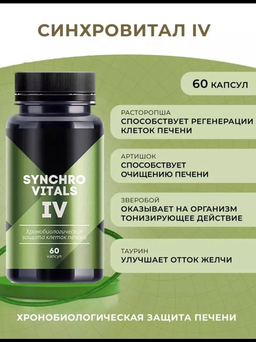Активные компоненты двухфазного комплекса «Синхровитал IV» помогают защитить клетки печени, активизировать их регенерацию, а также обеспечить мягкий детокс-эффект и улучшить отток желчи в соответствии с биоритмами.