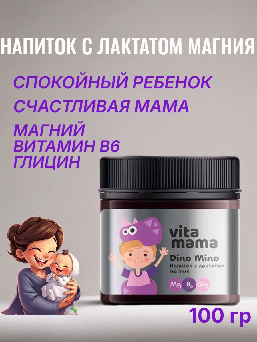 | Комплектация | Напиток с лактатом магния - Vitamama Dino Mino 100гр; магний для детей |